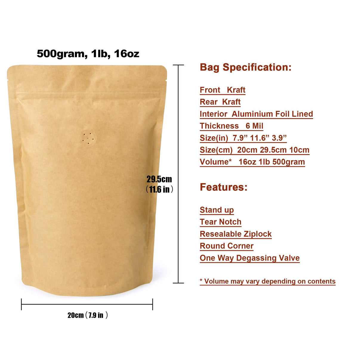 500G 16Oz 1Lb Kraft Paper Stand Up Zipper Pouches Coffee Bags Coffee Pouches With Valve (Pack Of 50)