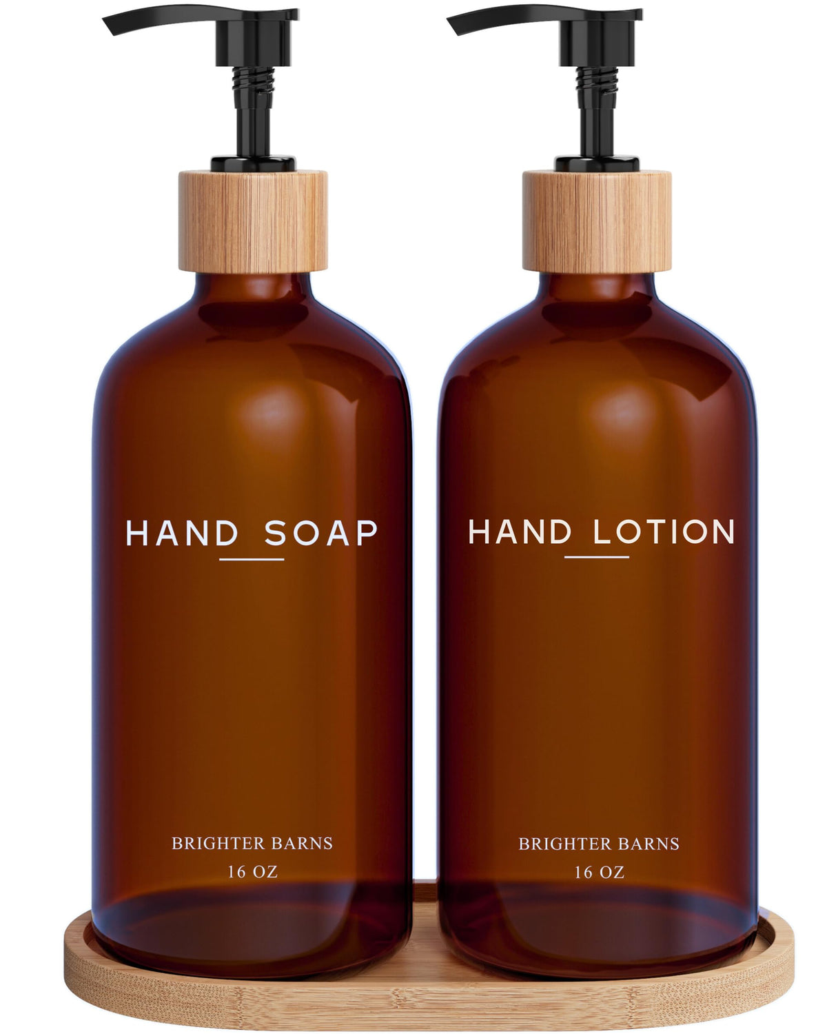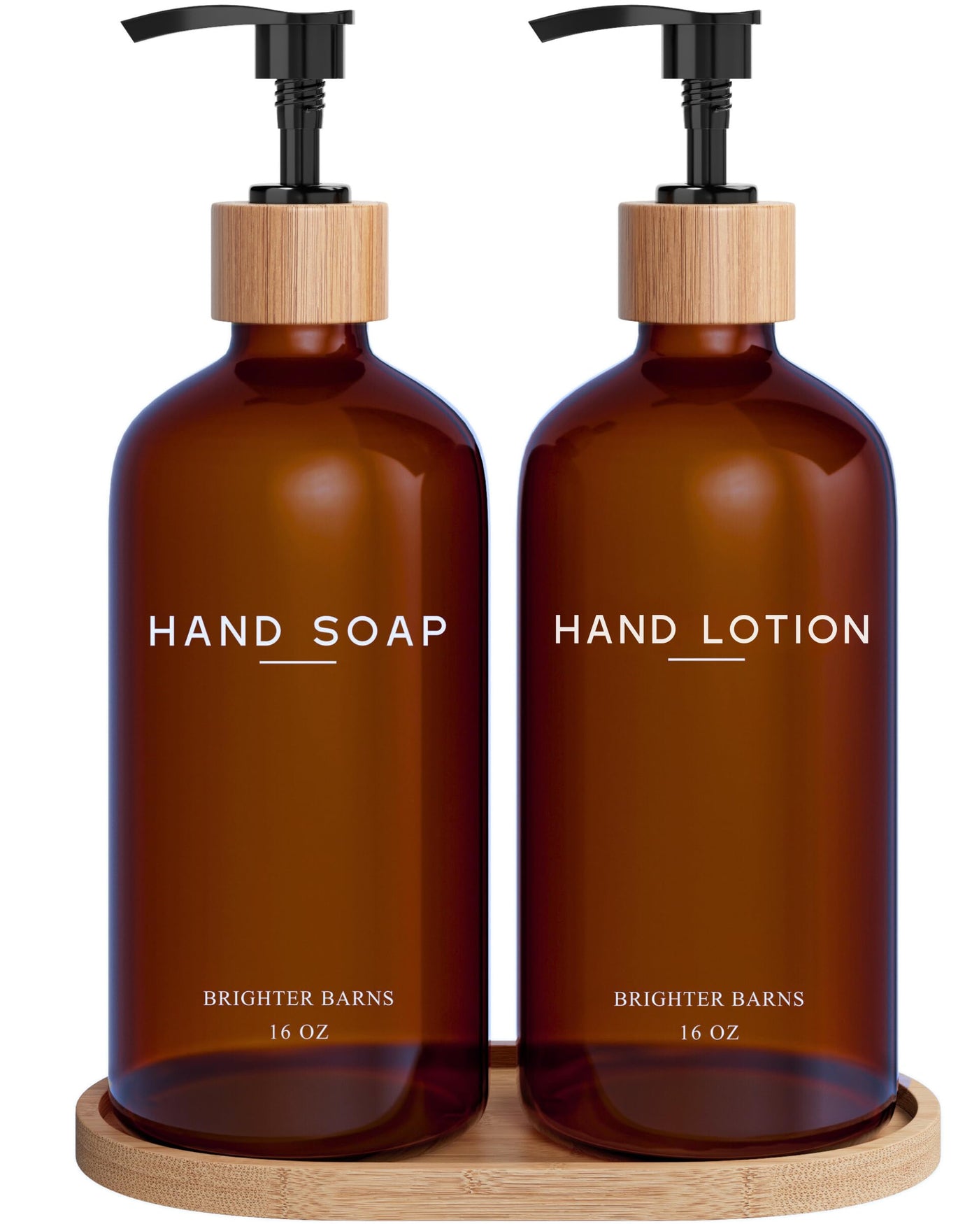 - Q: What is included in the Amber Glass Soap and Lotion Dispenser Set? A: The set includes a sleek glass soap dispenser, two BPA-free pumps, and a convenient bamboo tray.