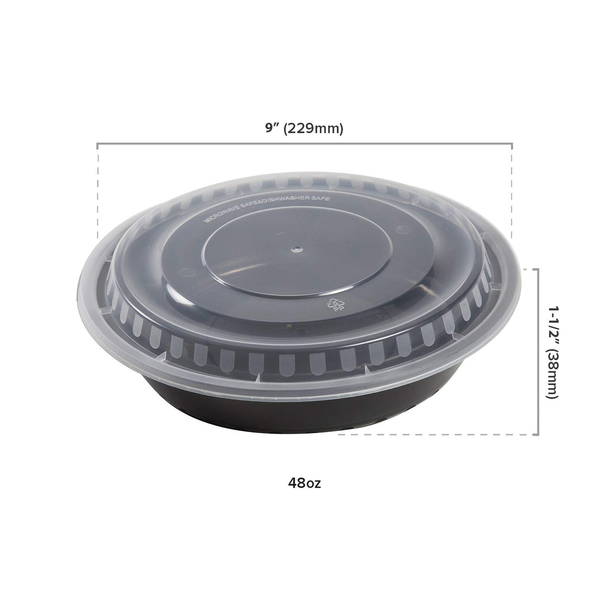 Amercare 9 Inch Round Black Plastic Containers With Lids, 48 Ounces For Microwave Or Freezer, Pack Of 150