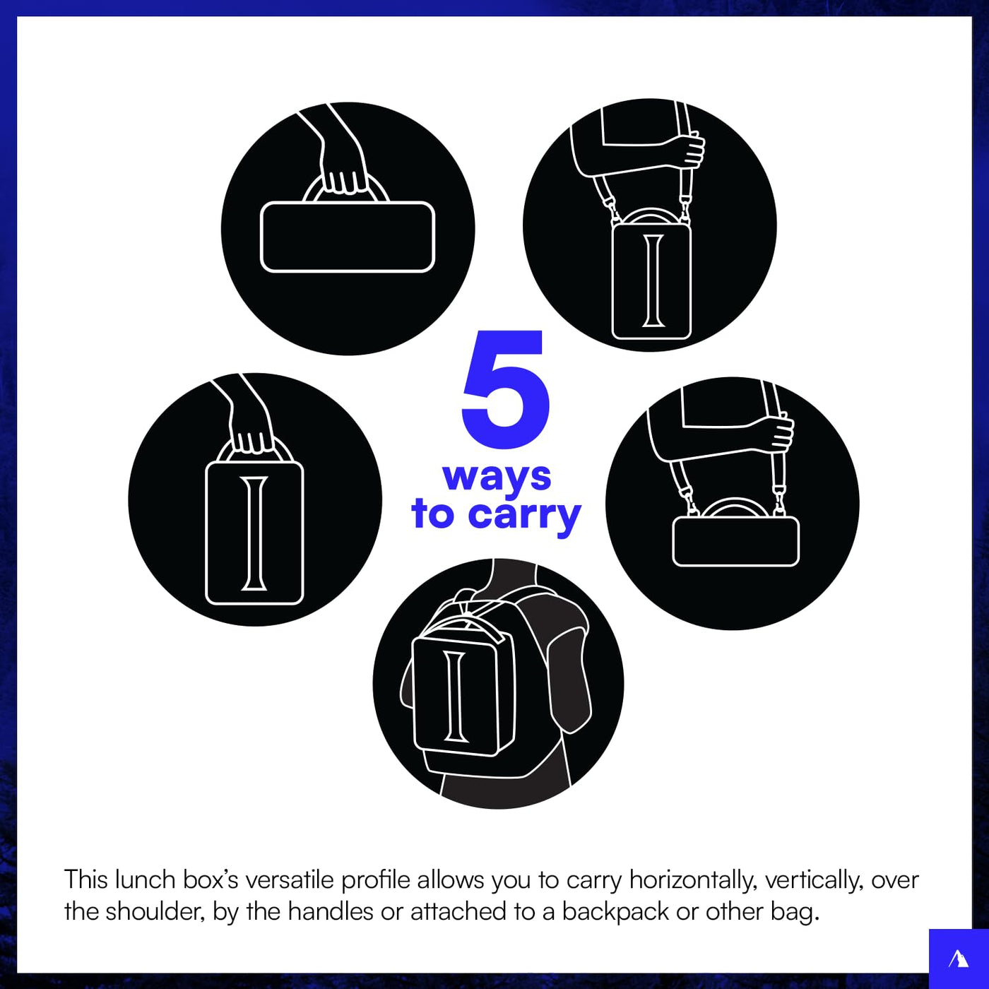 • Q: What are the carrying options for this lunch pack? A: You can carry the lunch pack horizontally, vertically, over your shoulder, by the handles, or attached to a backpack or bag.