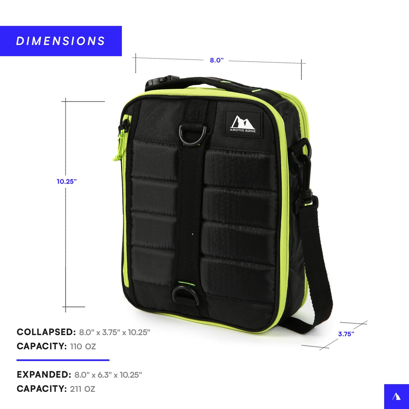 • Q: What is the capacity of the Arctic Zone Ultimate Upright Expandable Lunch Pack? A: The lunch pack has a standard capacity of 143 ounces, which nearly doubles to 270 ounces when expanded.