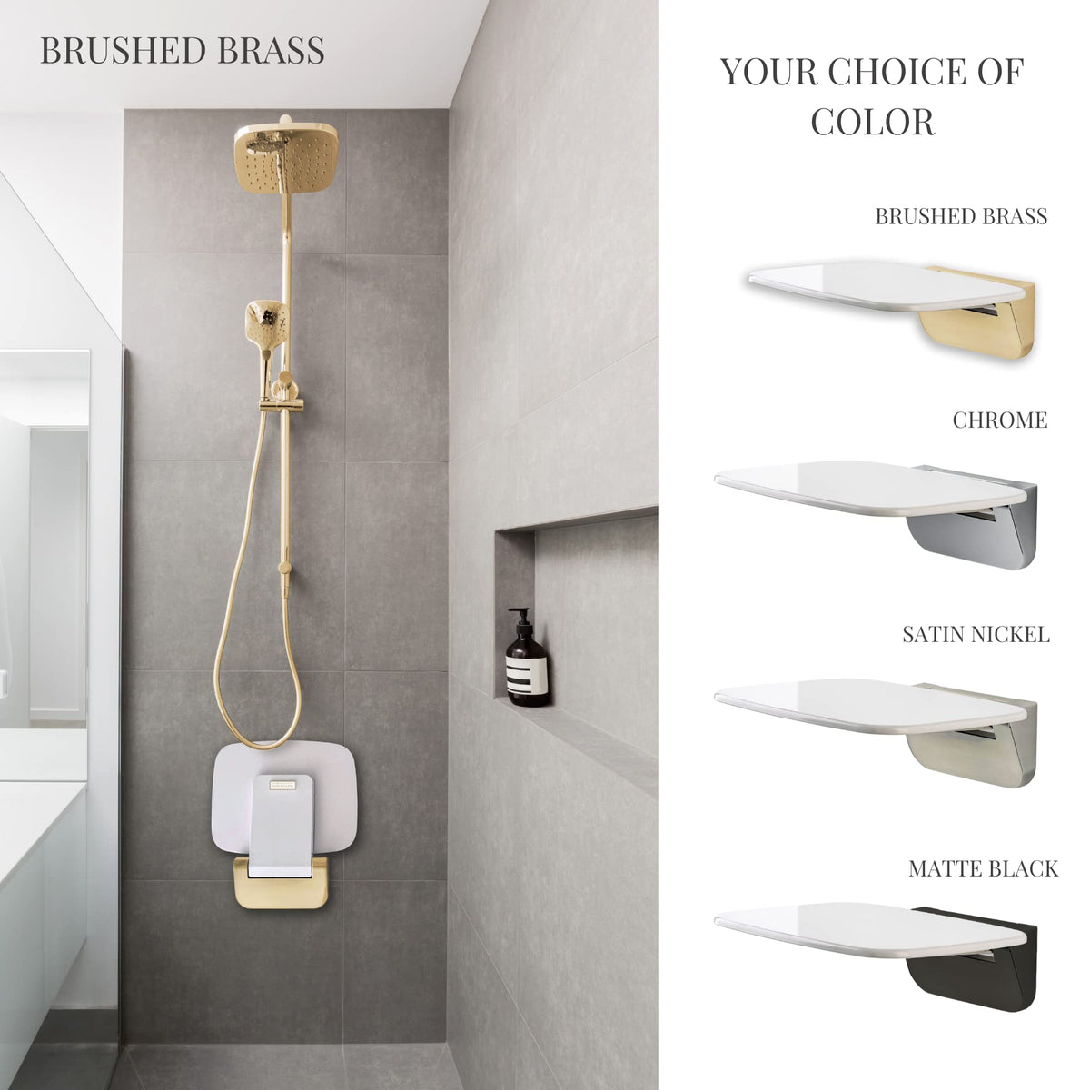 - Q: What materials is the shower seat made from? A: The specific materials are not listed, but the seat features a minimalist design with a classic white finish and silver metal trimming.