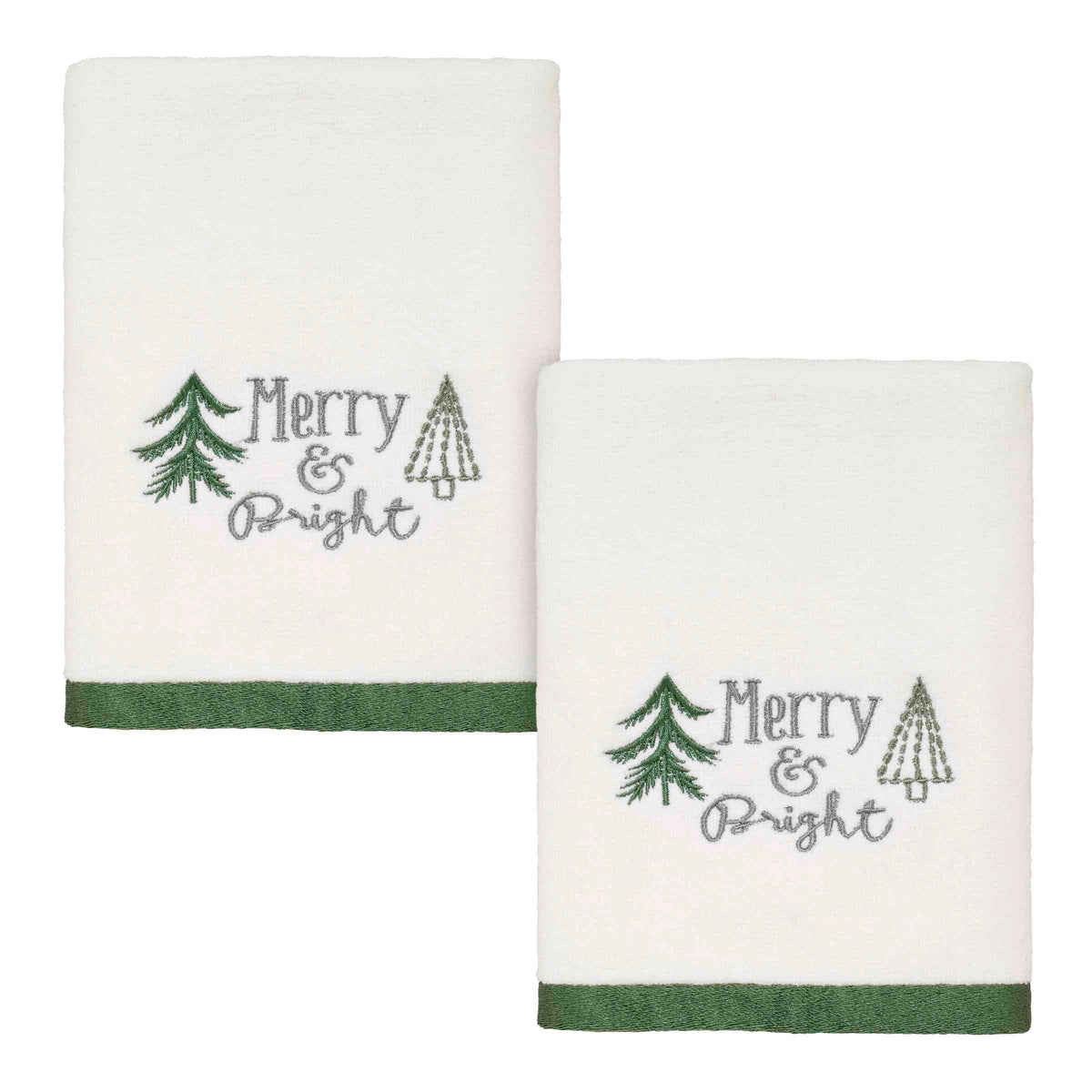- Q: What designs are featured on the Avanti Linens hand towels? A: The towels feature an embroidered 'Merry & Bright' design along with two whimsical Christmas trees.
