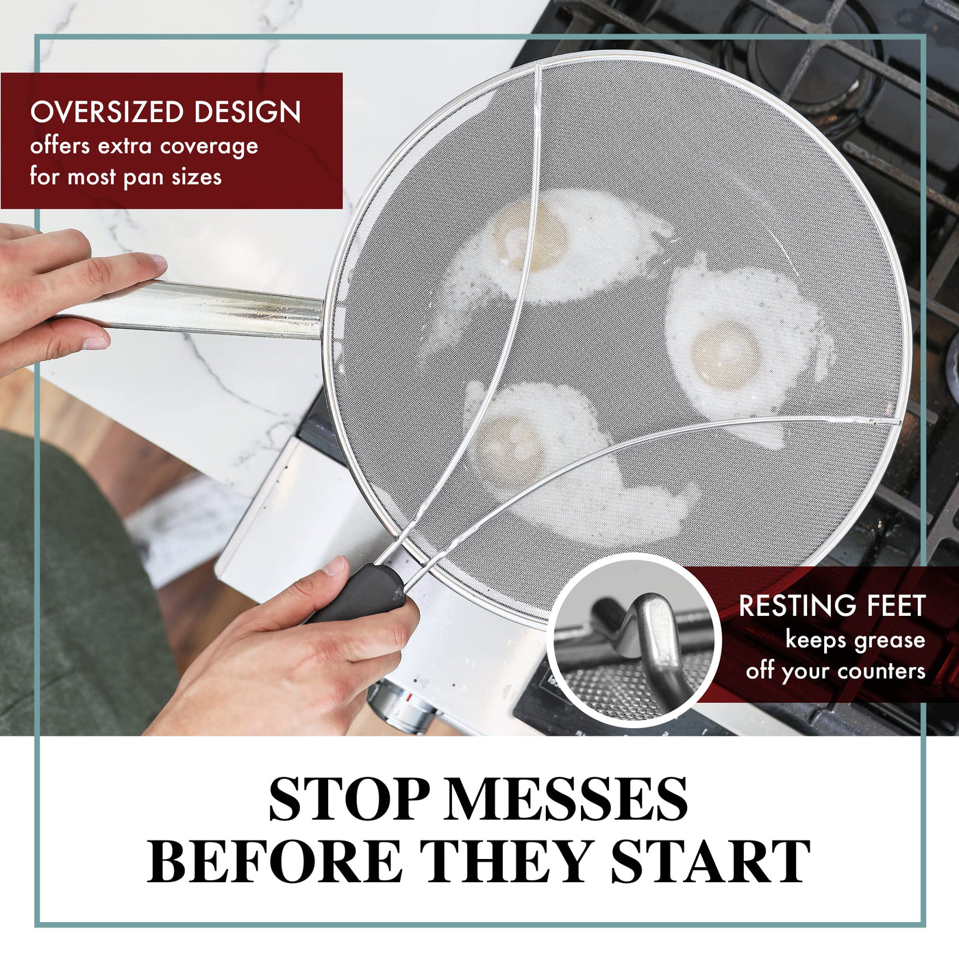 - Q: How does the splatter screen protect against burns? A: The splatter screen securely attaches to cookware handles, preventing hot oil from splattering and causing painful burns.
