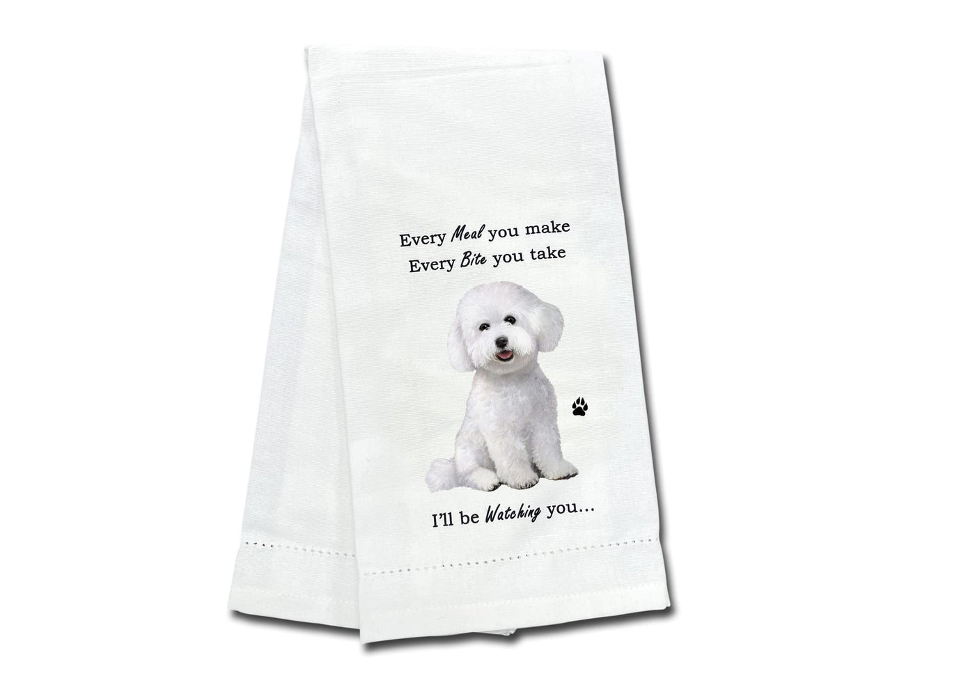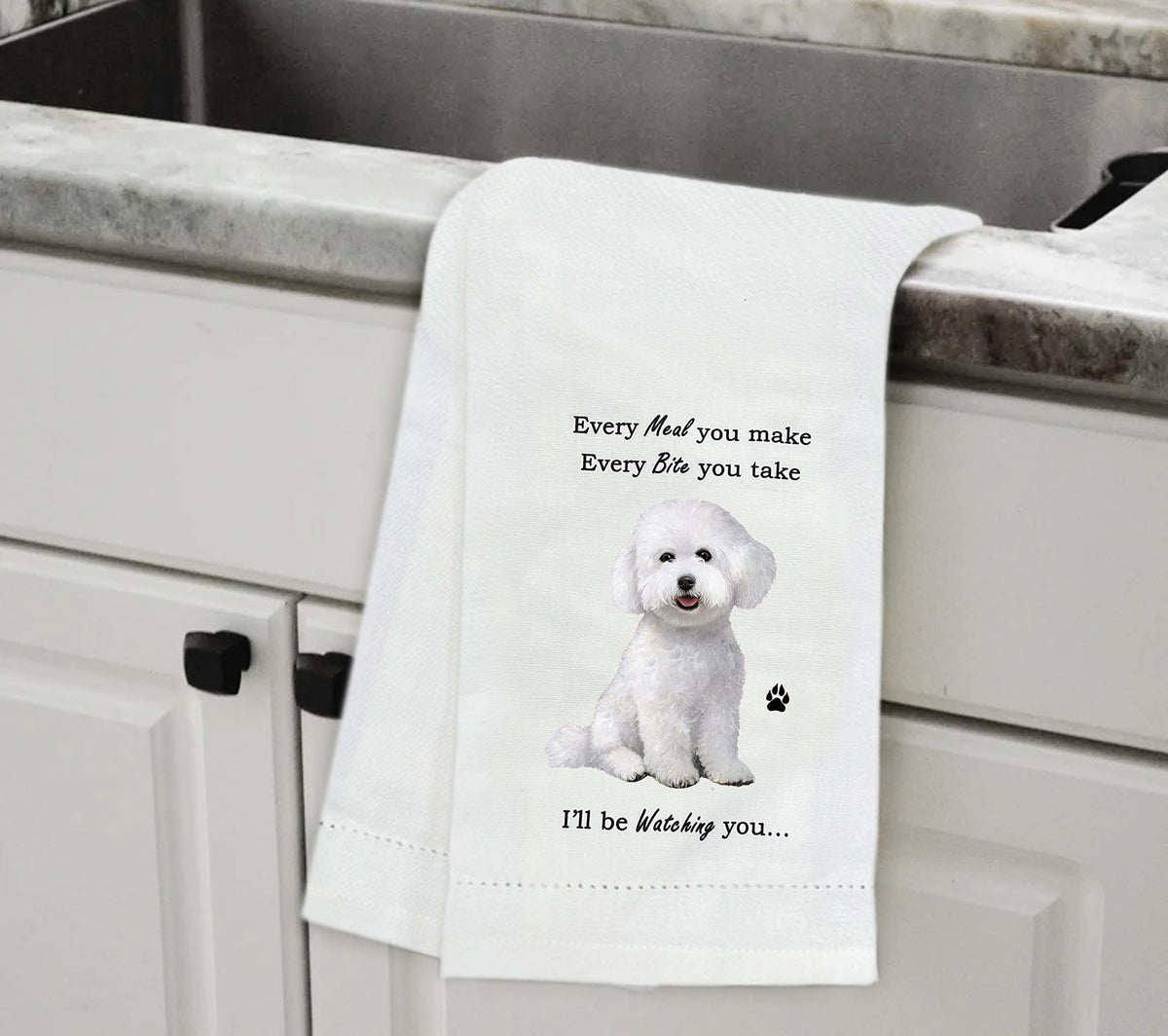 - Q: What size is the Bichon Frise Kitchen Towel? A: The Bichon Frise Kitchen Towel measures 18 inches by 26 inches.