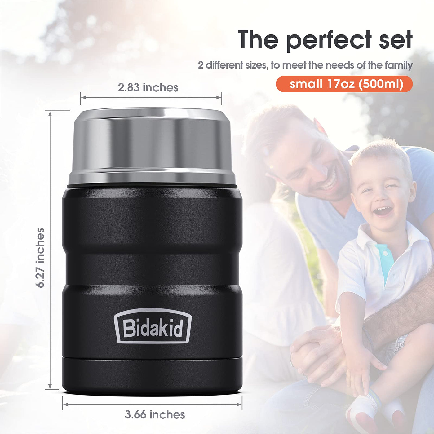 - Q: What sizes are included in the Bidakid insulated food jar set? A: The set includes two insulated jars: a 25.4oz (750ml) jar for hearty meals and a 17oz (500ml) jar for smaller portions.