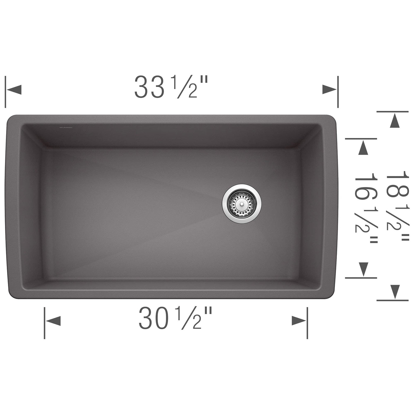 • Q: What are the dimensions of the BLANCO Cinder 441764 sink? A: The dimensions of the BLANCO Cinder 441764 DIAMOND SILGRANIT Super Single Undermount Kitchen Sink are 33.5 inches in length and 18.5 inches in width.