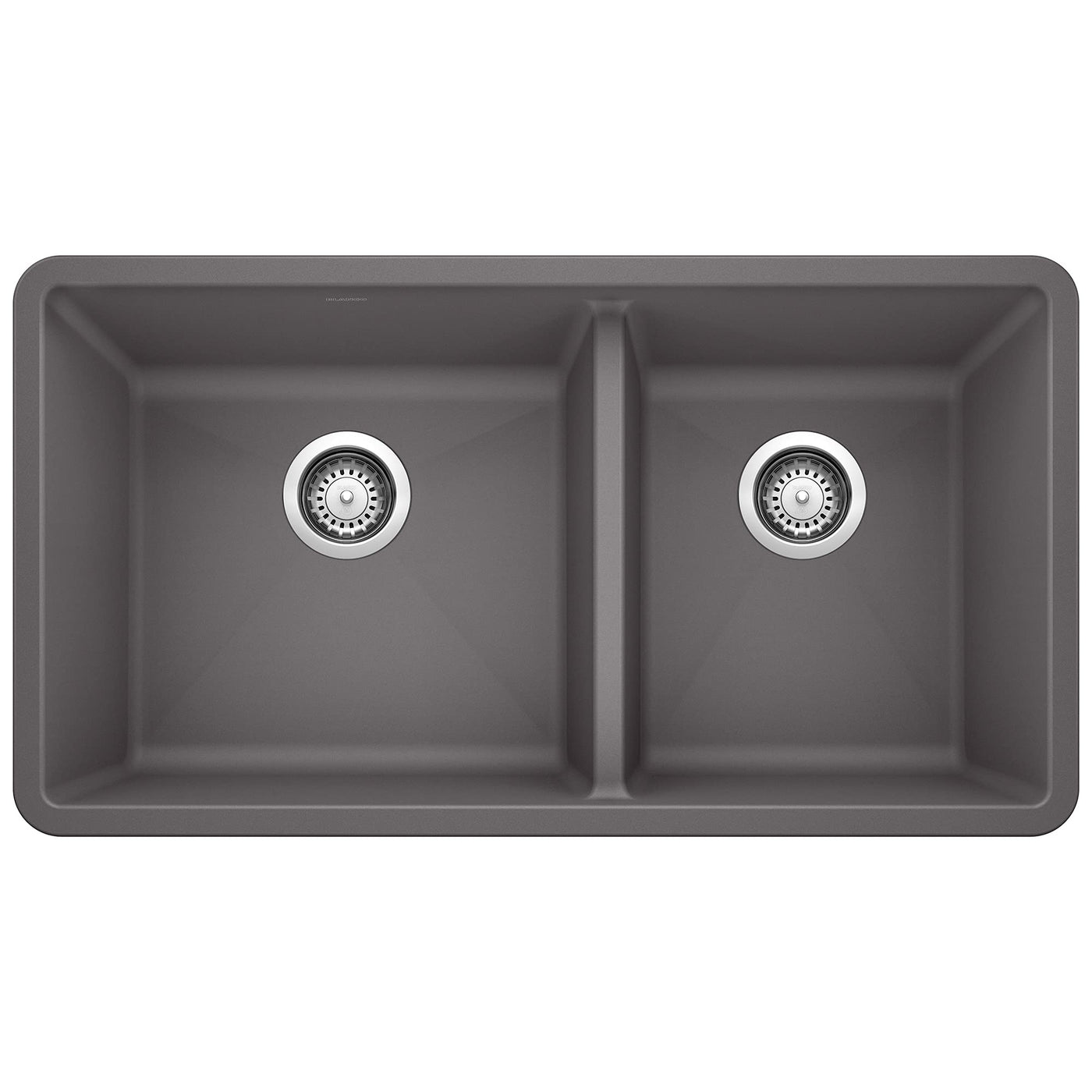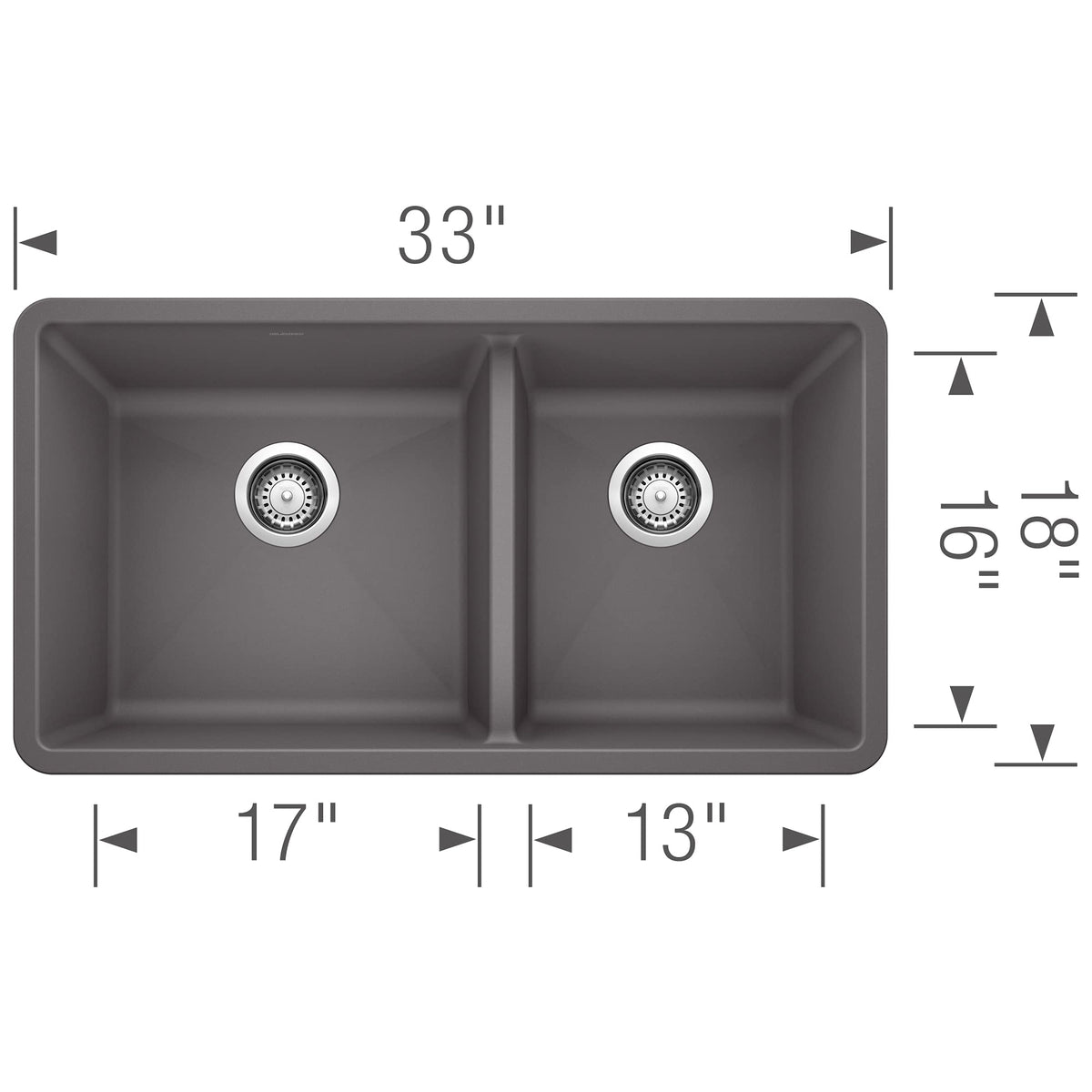 • Q: What are the dimensions of the BLANCO 441479 Precis Double Bowl Sink? A: The dimensions of the BLANCO 441479 Precis Double Bowl Sink are thirty-three inches long, eighteen inches wide, and nine and a half inches deep.