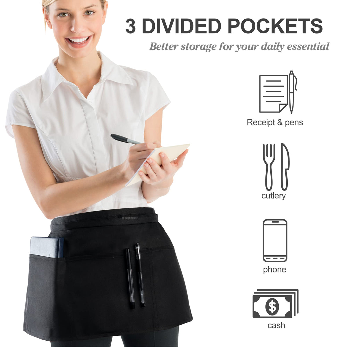 - Q: How many pockets does the BOHARERS apron have? A: The BOHARERS apron features three pockets, providing ample space for holding server books, guest check pads, tips, phones, pens, and more.