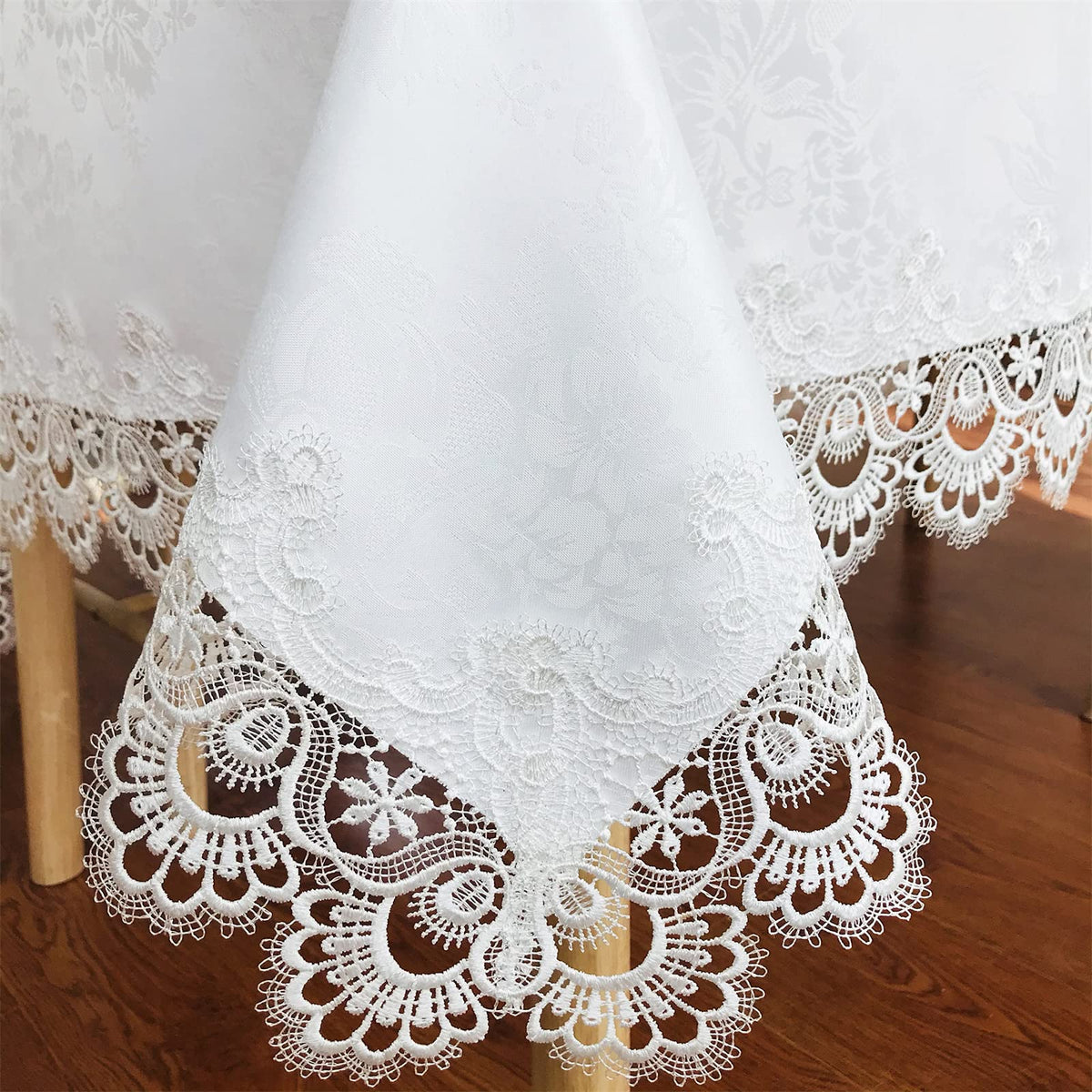 • Q: Does the tablecloth have a special design feature? A: Yes, the tablecloth features a unique water-soluble lace design that adds an elegant touch to any table setting.
