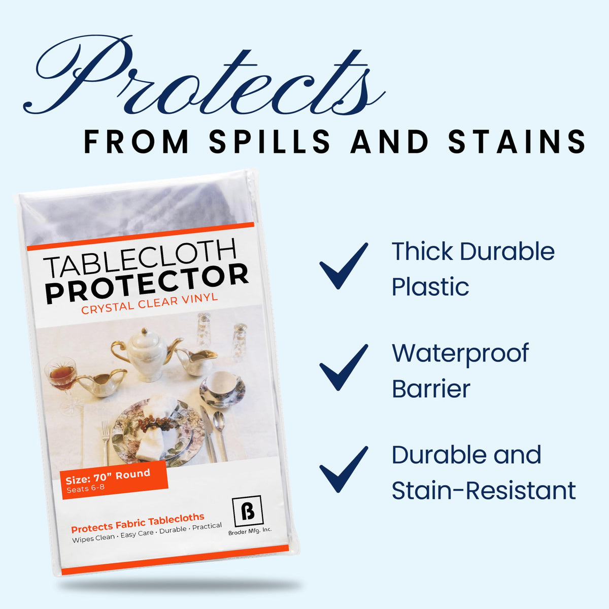 • Q: What size is the BRODER MFG. INC. Tablecloth Protector? A: The BRODER MFG. INC. Tablecloth Protector is available in a 70-inch round size, making it suitable for most standard round tables.