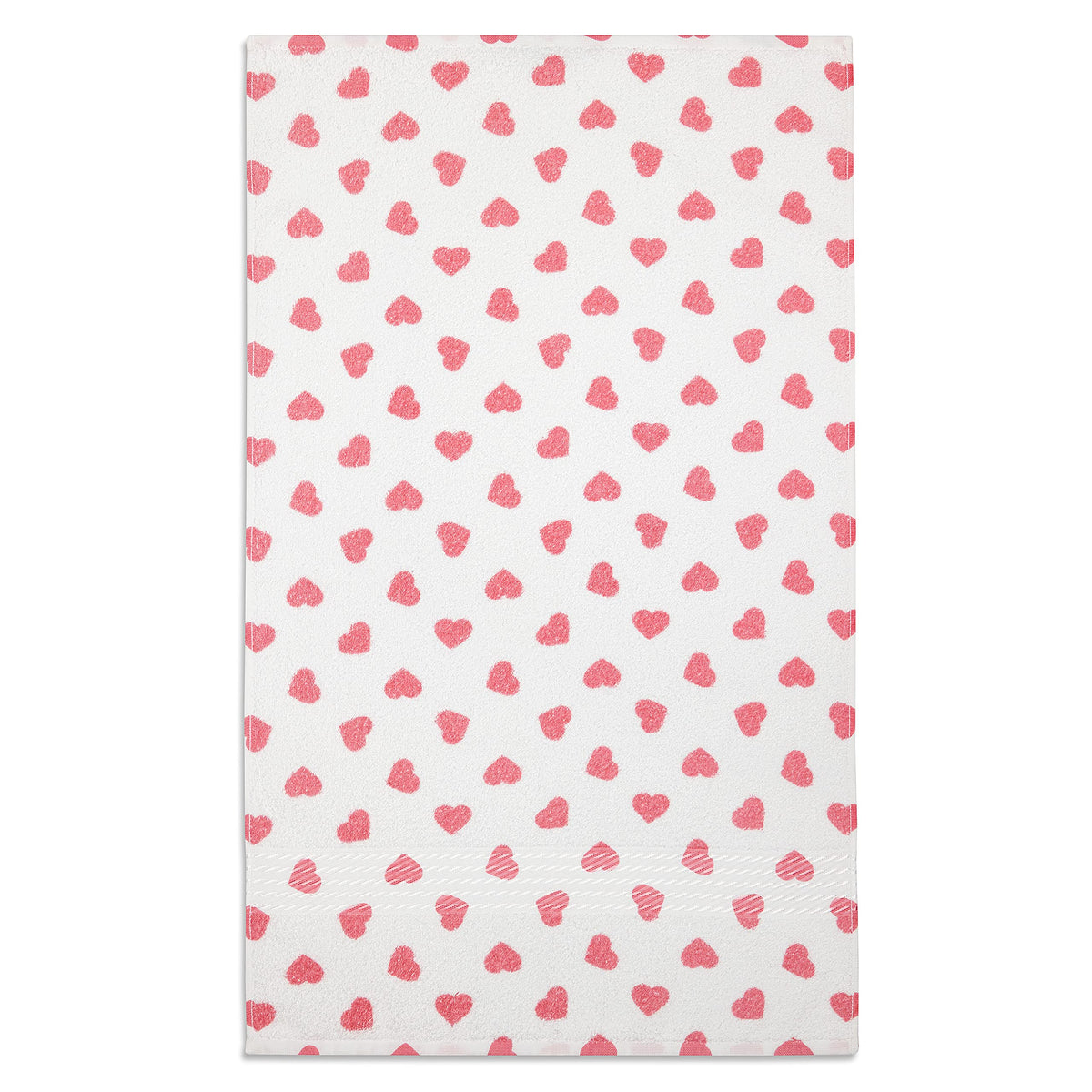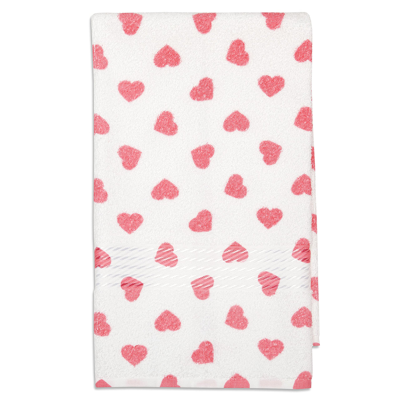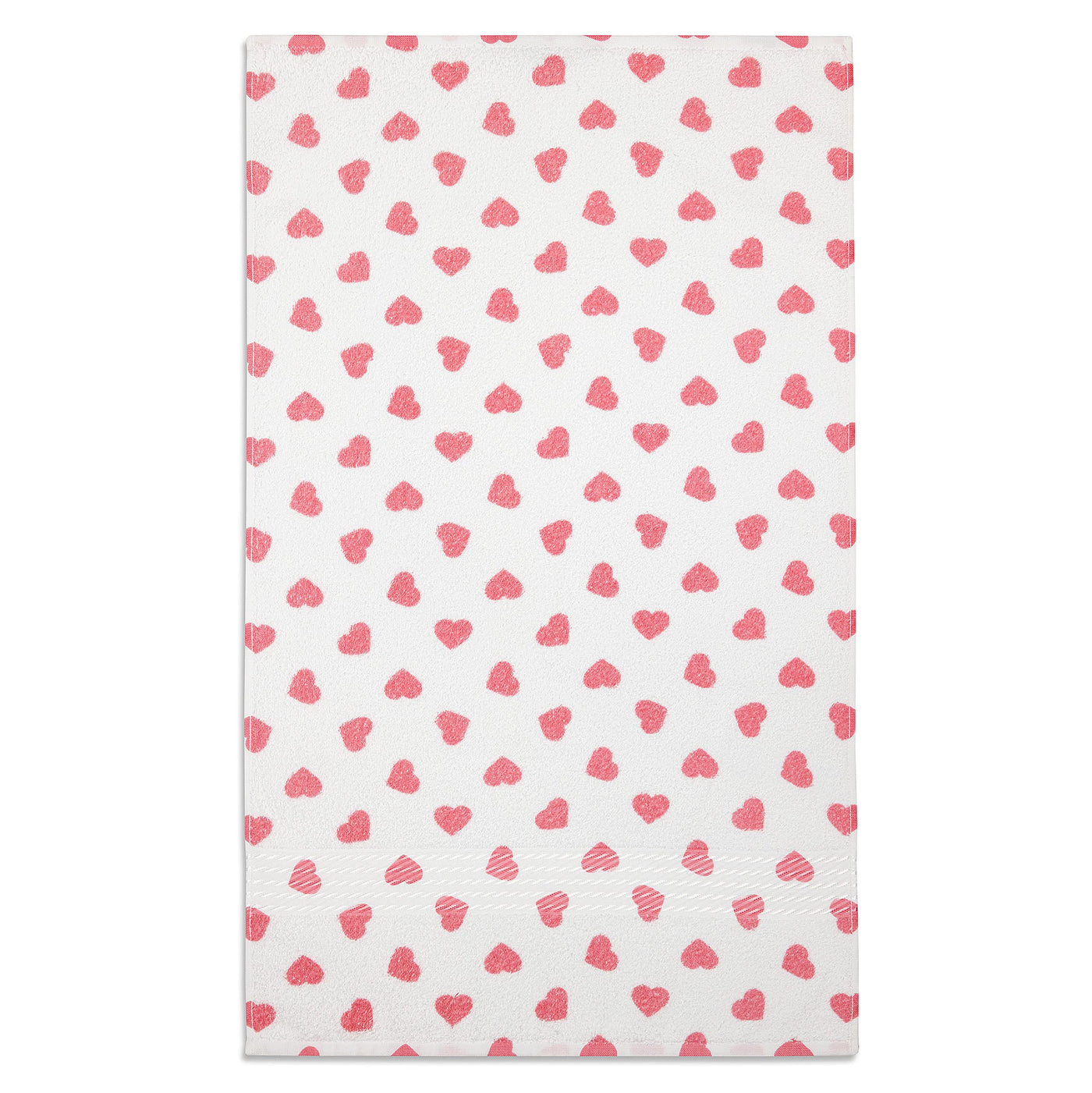 - Q: What is the design of the towels? A: The towels feature adorable pink hearts all over, with a decorative border that has a satin sheen.