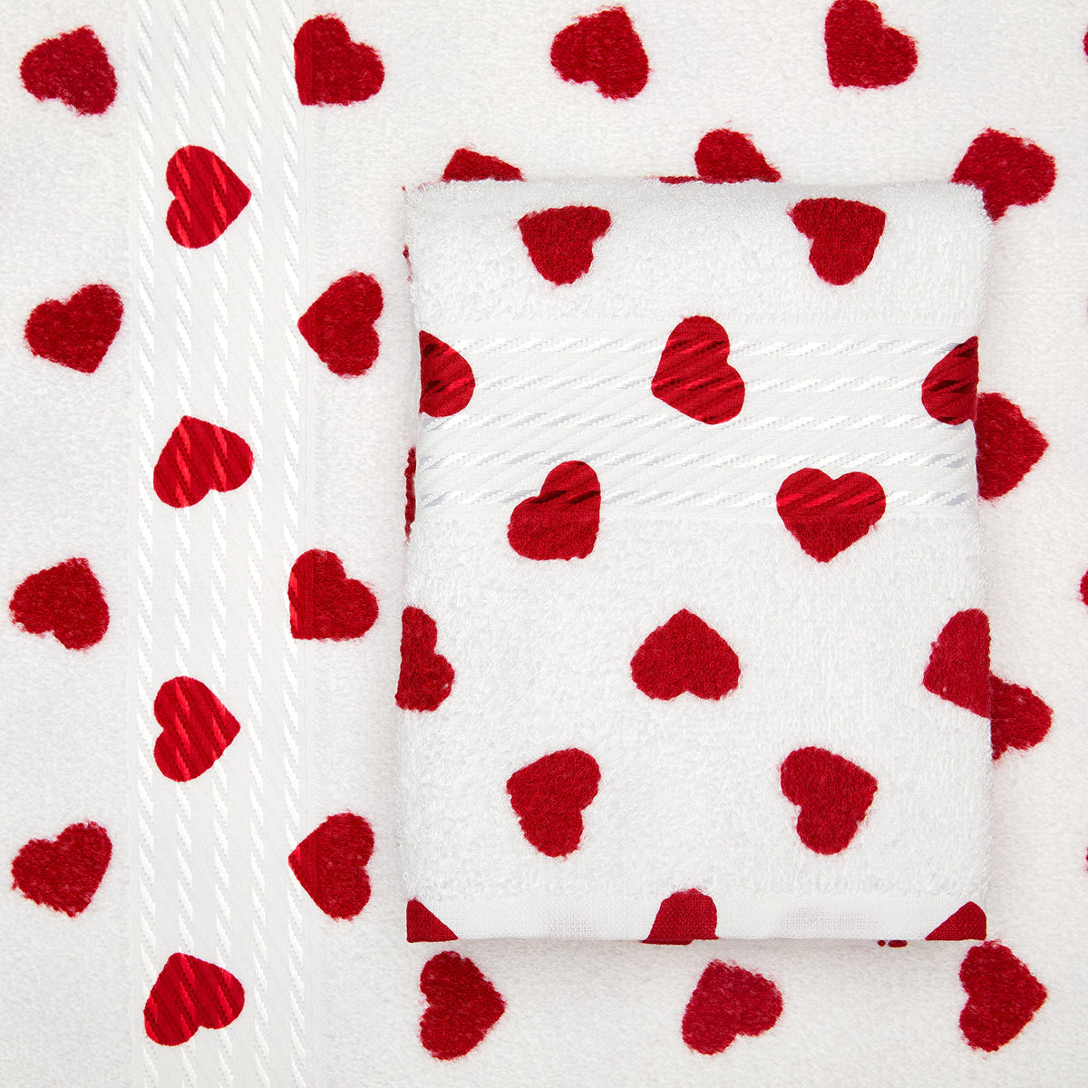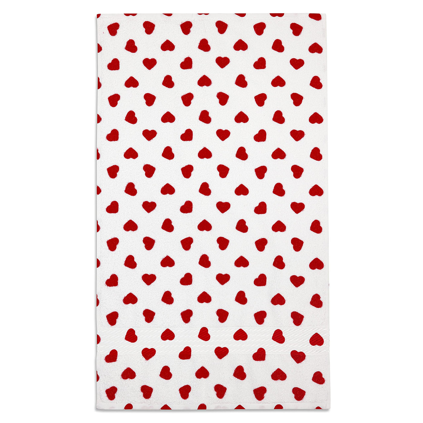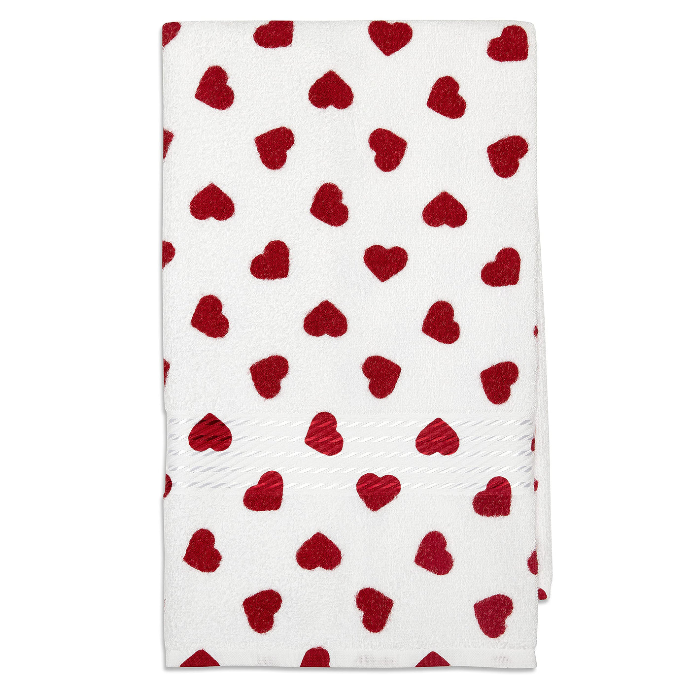 • Q: Do the towels have any decorative features? A: Yes, they feature adorable red hearts all over and a decorative border with a satin sheen.