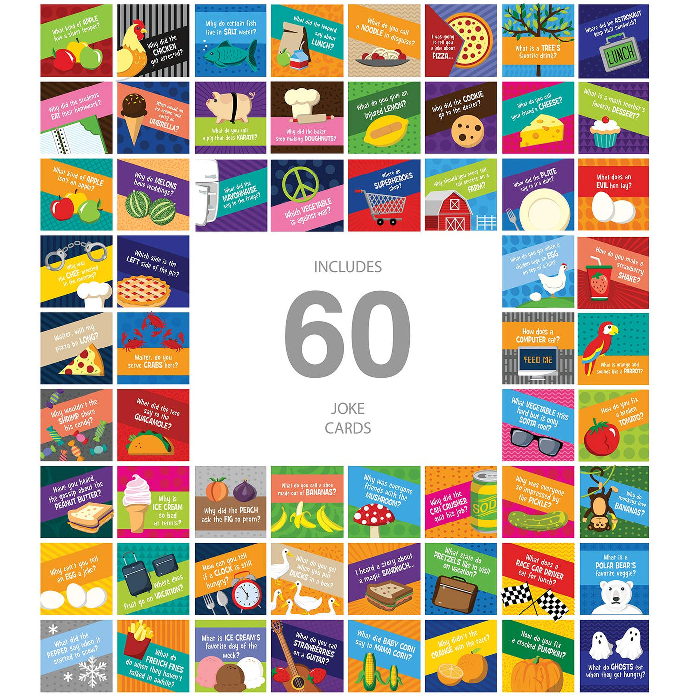- Q: How many jokes are included in the set? A: The set includes a total of 60 unique food-themed jokes.