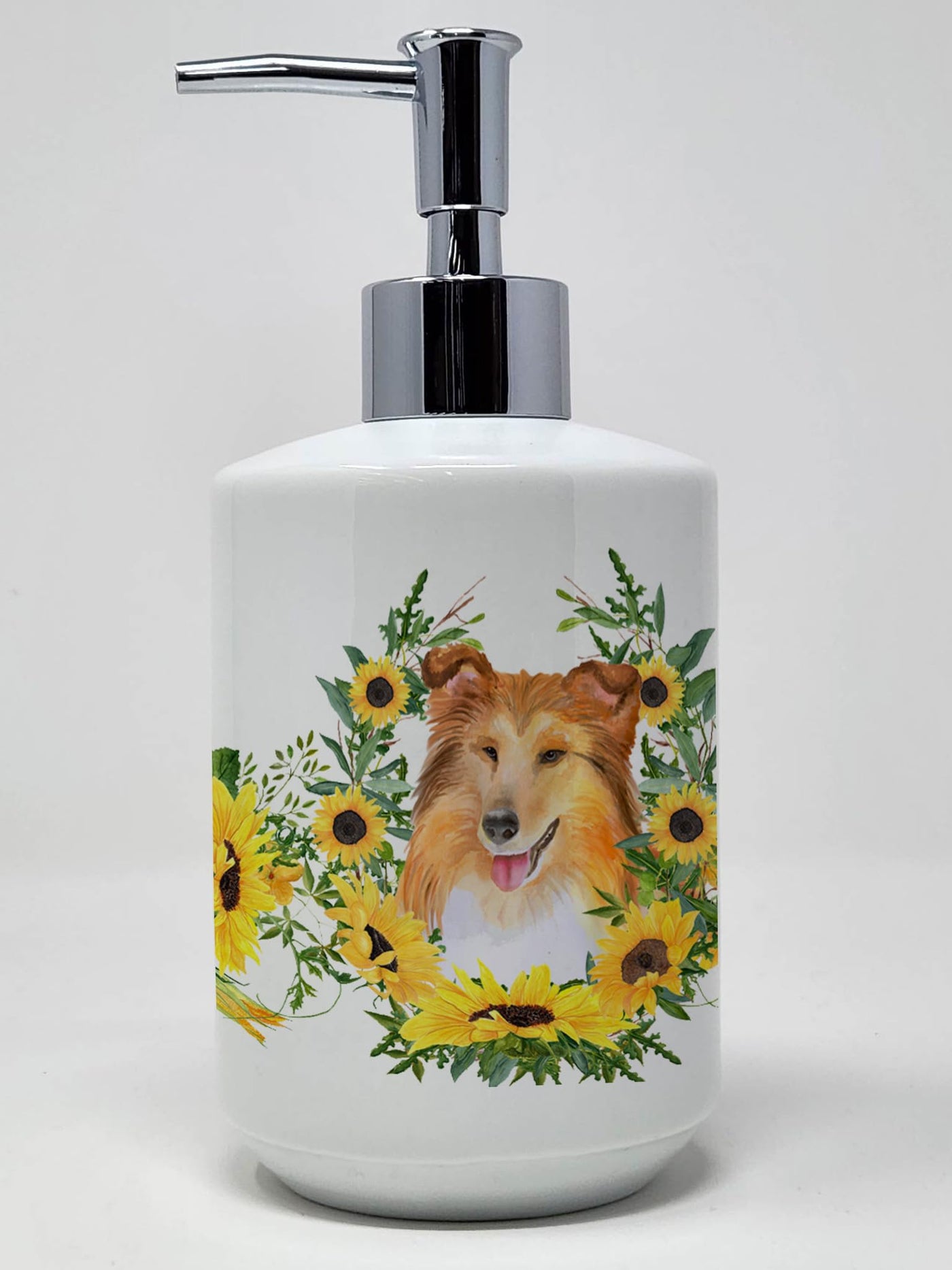 Caroline'S Treasures Ck2912Soap Sheltie In Sunflowers Ceramic Soap Dispenser Hand Soap Dispenser Pump Bottles For Bathroom Kitch
