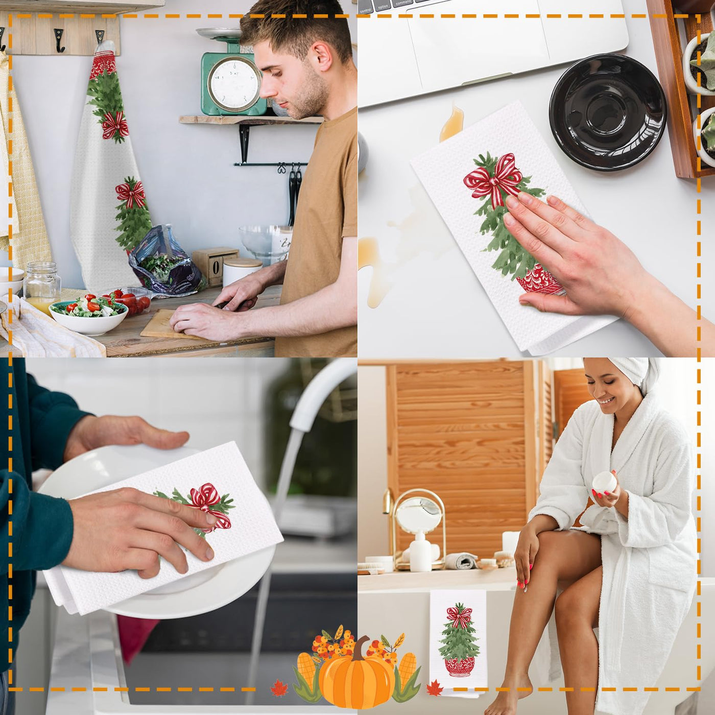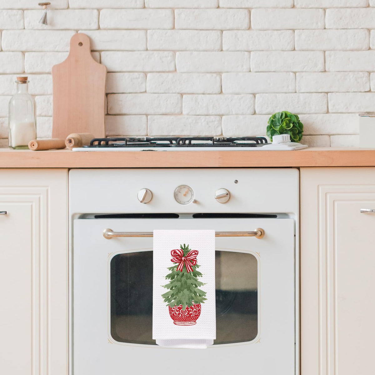 Chinoiserie Christmas Tree Kitchen Towels, Christmas Red Stripe Bow Decorative Hand Towels For Bathroom, Christmas Dish Towels F