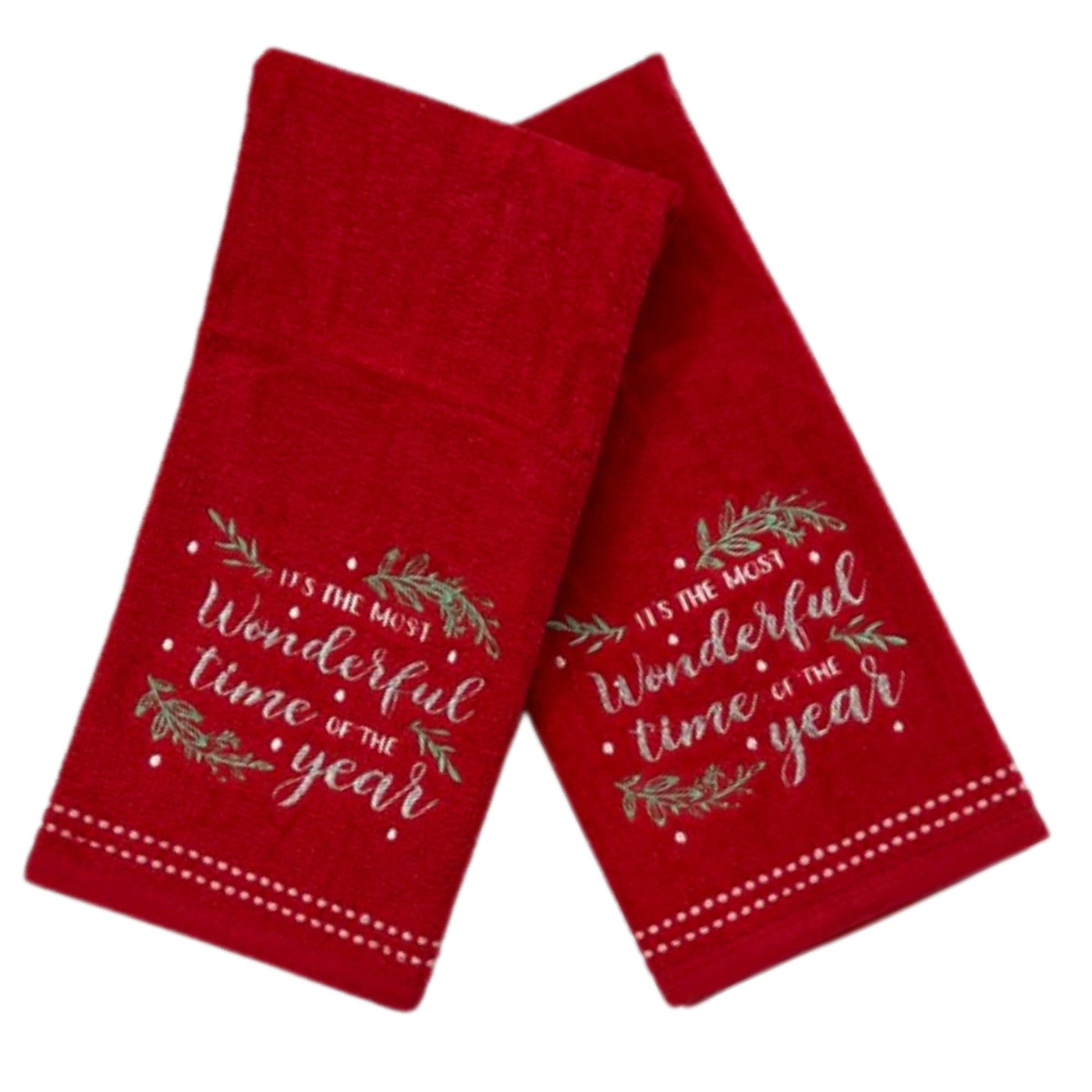 • Q: What design features do these towels have? A: The towels feature an embroidered holiday message, 'It's the most wonderful time of the year,' with green mistletoe accents and a dotted hem for an elegant touch.