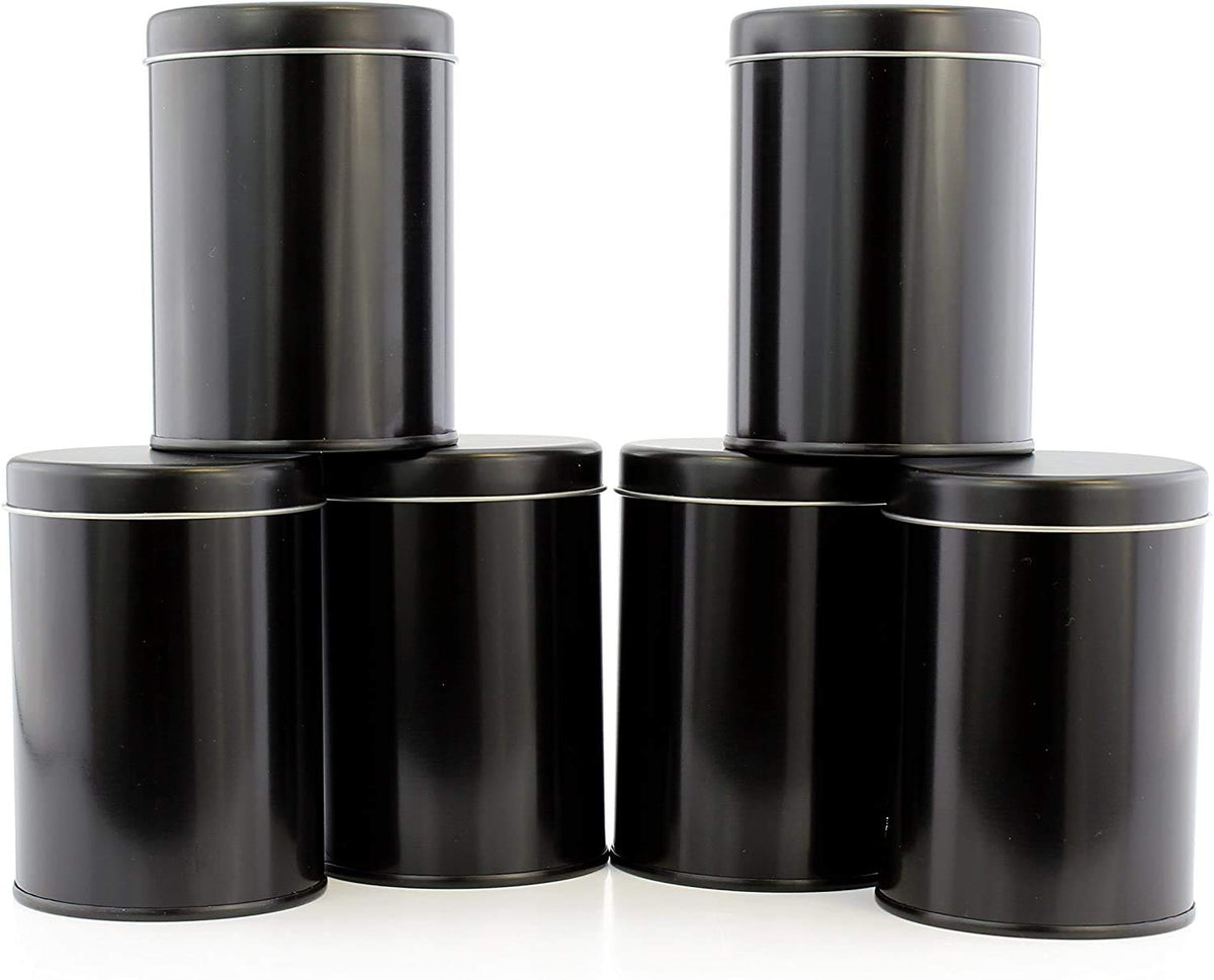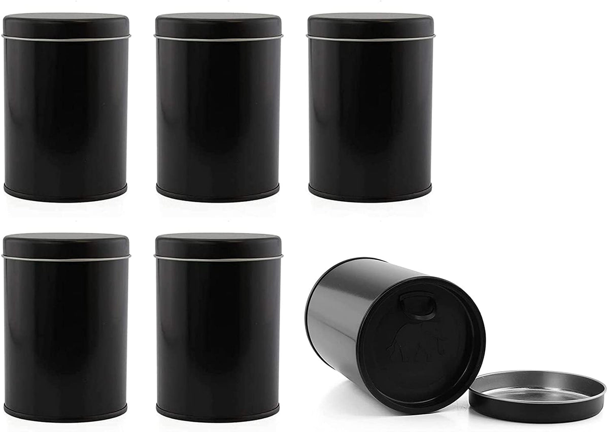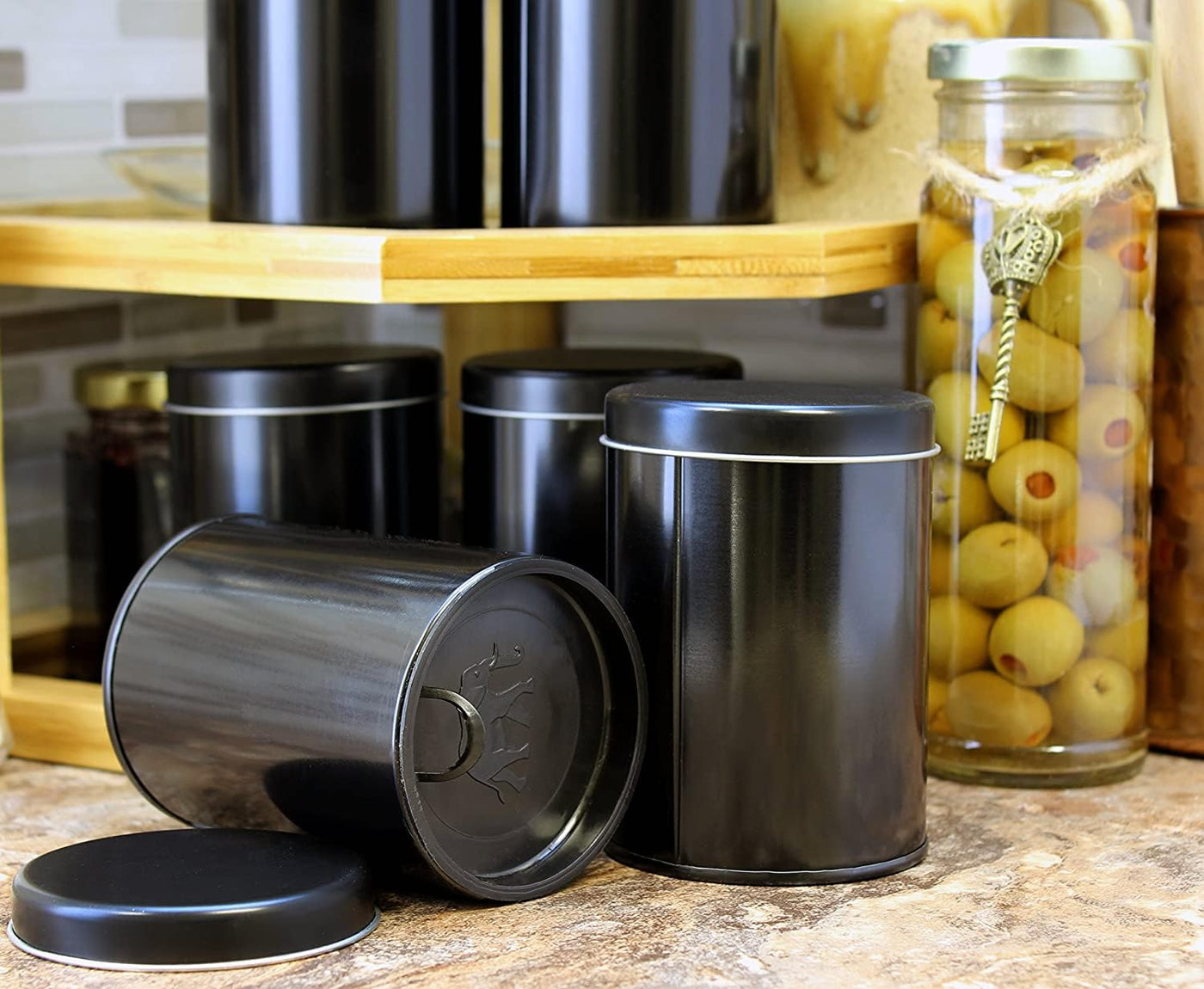 Cornucopia Double Seal Tea Canisters (6-Pack); Black Metal Round Tea Tins W/ Interior Molded Plastic Seal