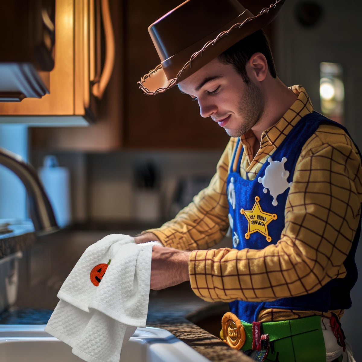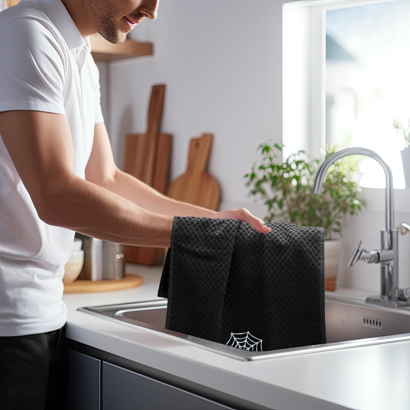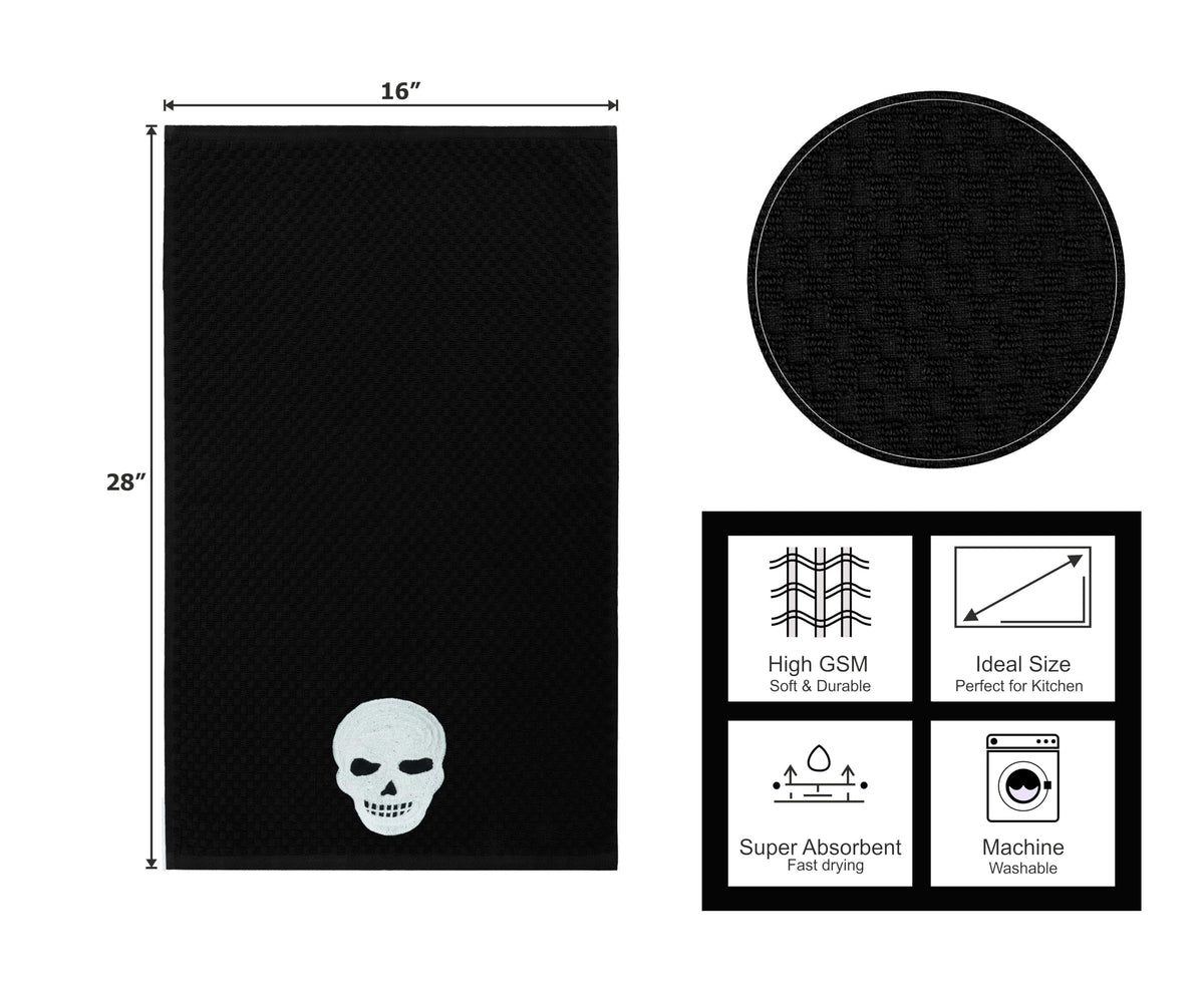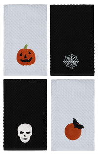 COTTON CRAFT Halloween Kitchen Towels - 4 Pack Spooky Skull Web Bats Jack OLantern Embroidered Terry Towel - 100% Cotton Waffle