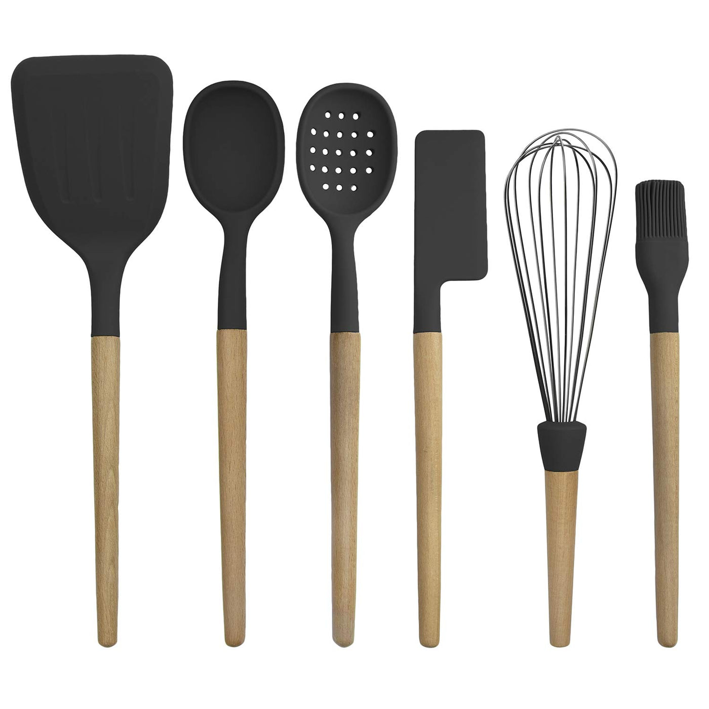 • Q: What is included in the 6-piece set? A: The set includes 1 serving and mixing spoon, 1 perforated spoon and skimmer, 1 turner, 1 angled spatula, 1 egg and oil brush, and 1 whisk.