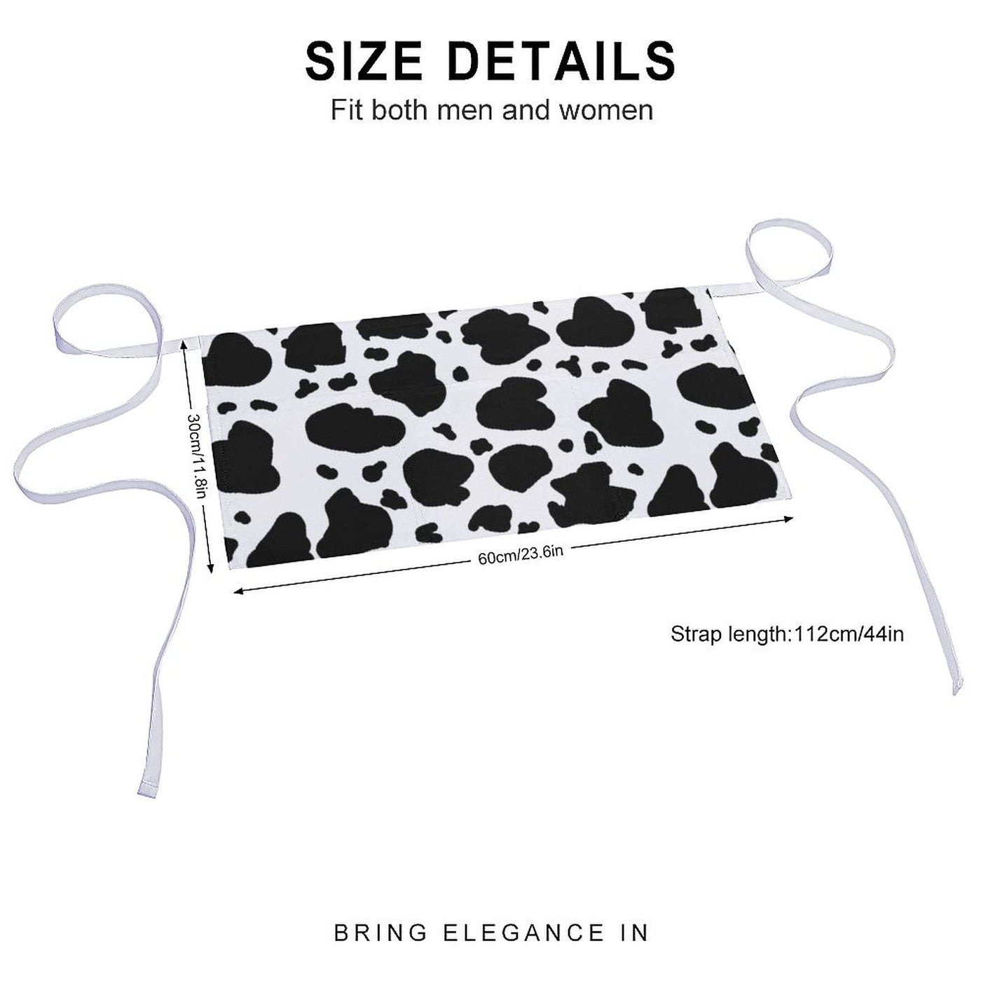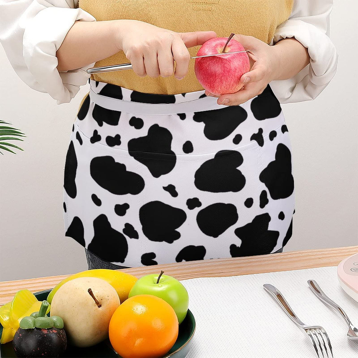 - Q: What material is the Cow Print Half Waist Apron made from? A: The Cow Print Half Waist Apron is made from polyester, which is soft, comfortable, and durable.