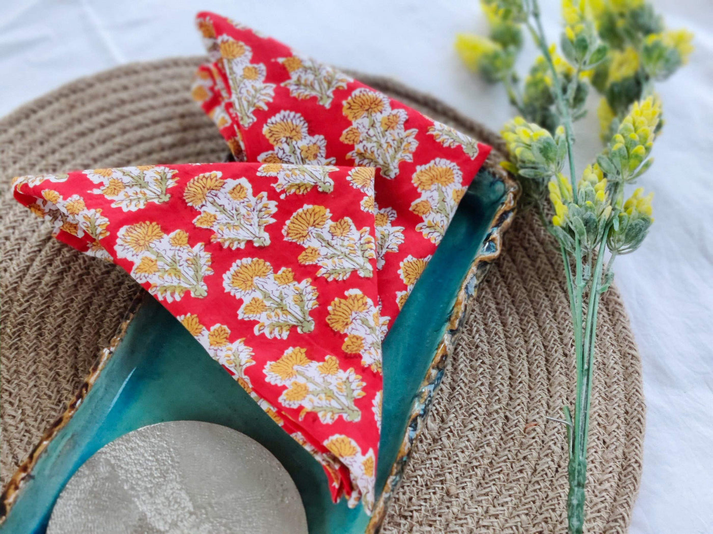 • Q: What kind of patterns do the napkins feature? A: The napkins feature traditional Indian paisley and floral patterns, hand-printed in Jaipur.