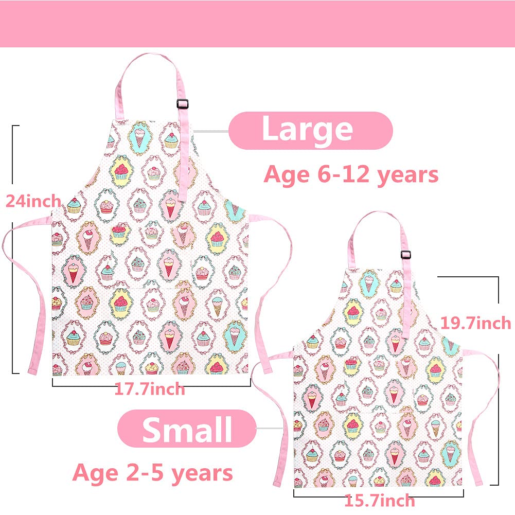 - Q: What size is the large apron, and what age does it fit? A: The large apron measures 17.7 inches by 24 inches and is suitable for children aged 6 to 12 years.