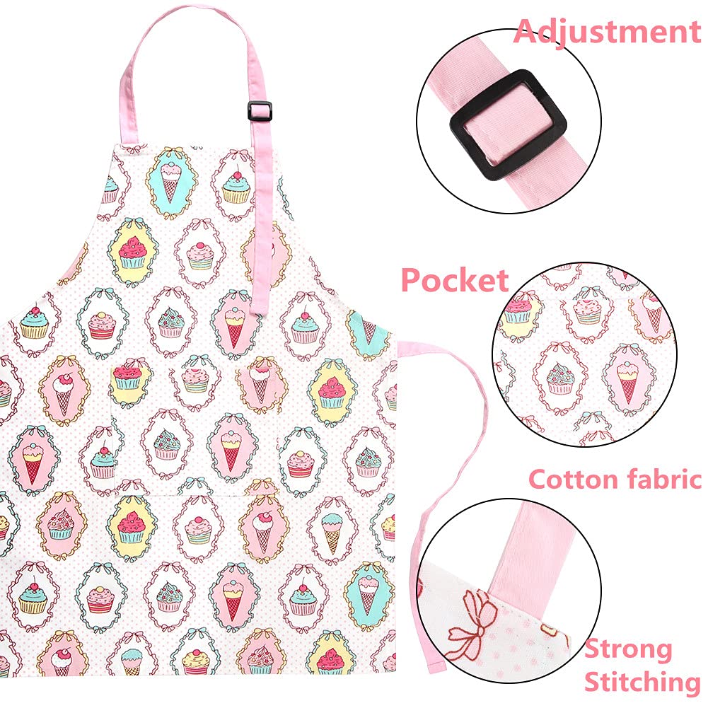 - Q: What design elements does the apron feature? A: The apron is printed with a cute cupcake design and includes a large front pocket for children to hold cooking accessories, art tools, or craft supplies.