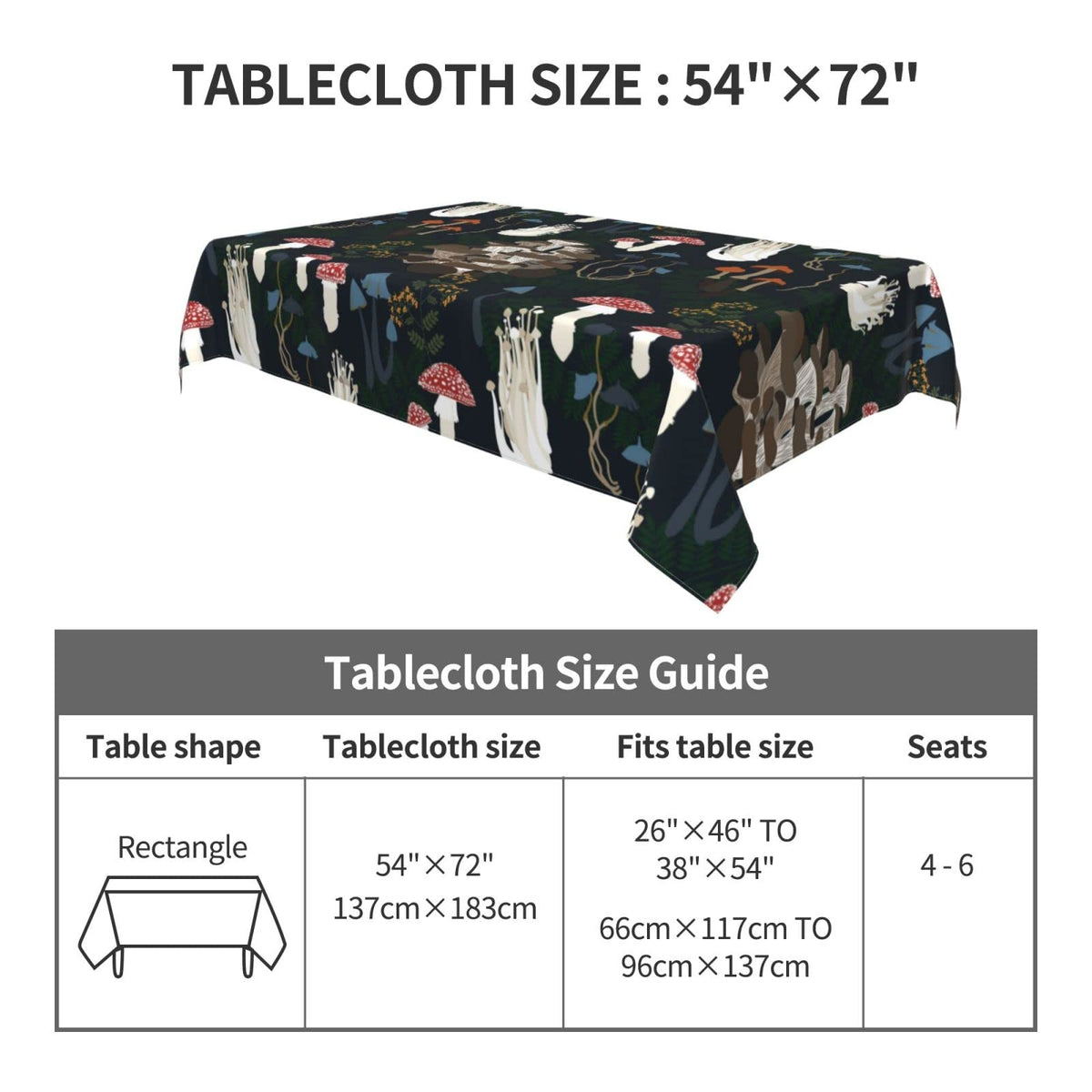 - Q: What size is the Cukemip Mushroom Botanic Tablecloth? A: The Cukemip Mushroom Botanic Tablecloth measures 54 inches by 72 inches, making it suitable for various table sizes.
