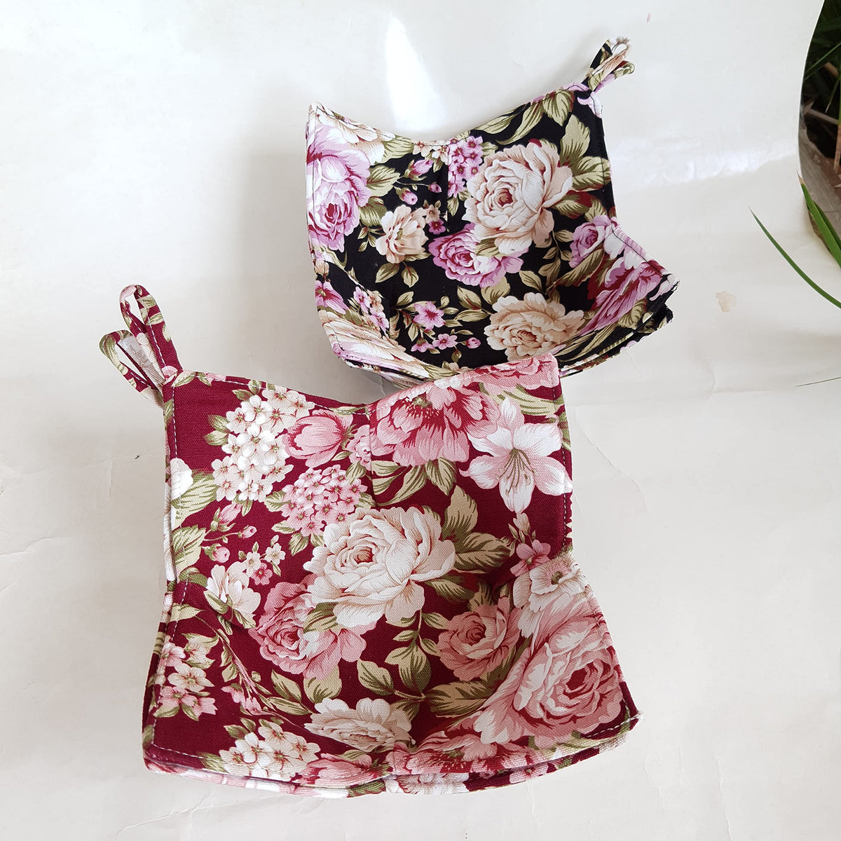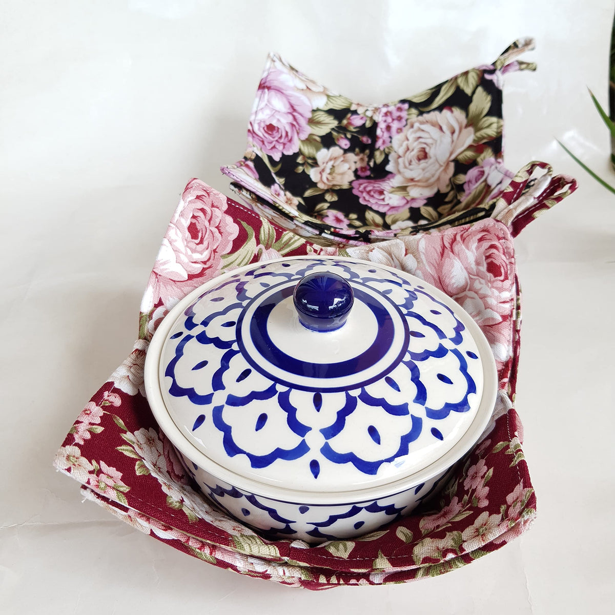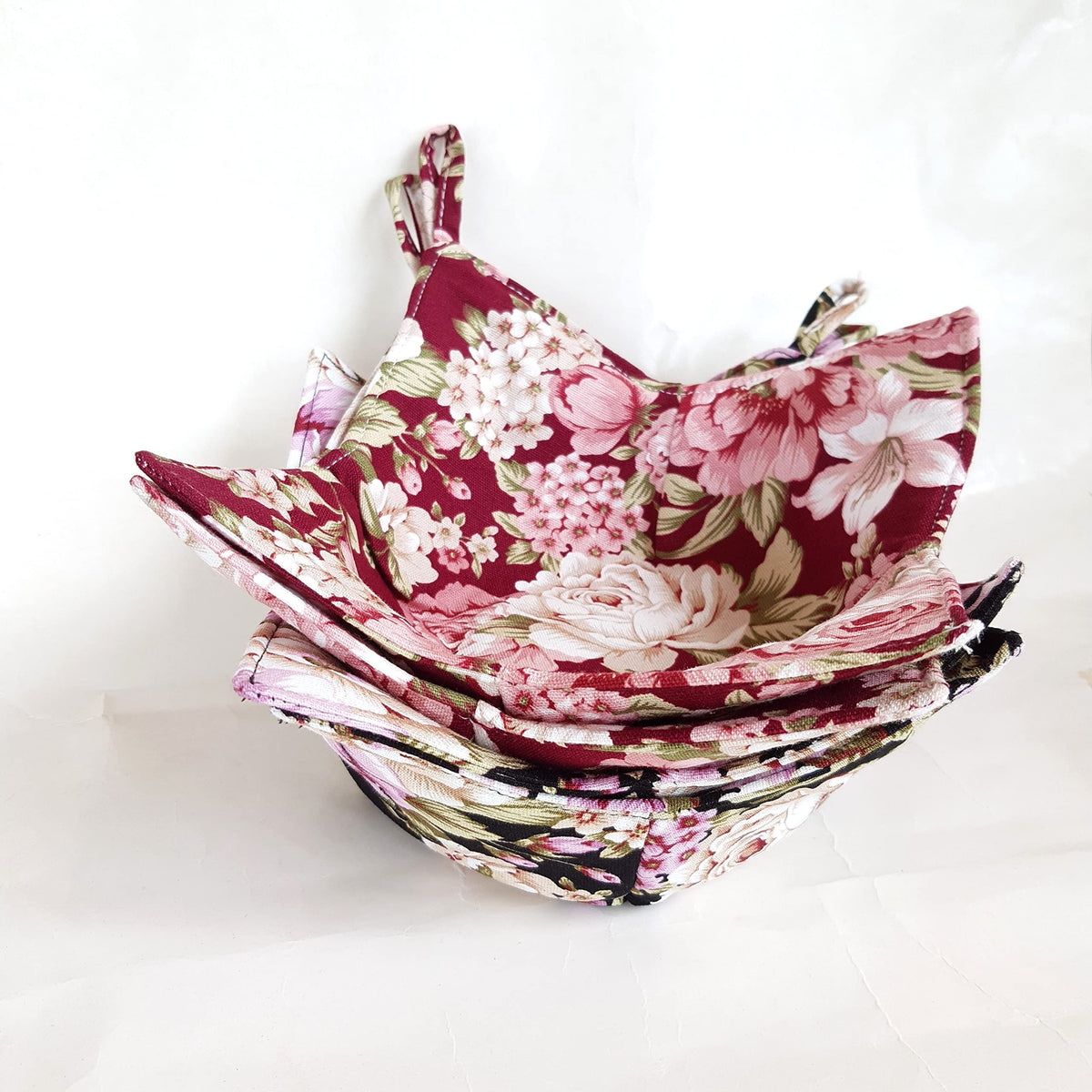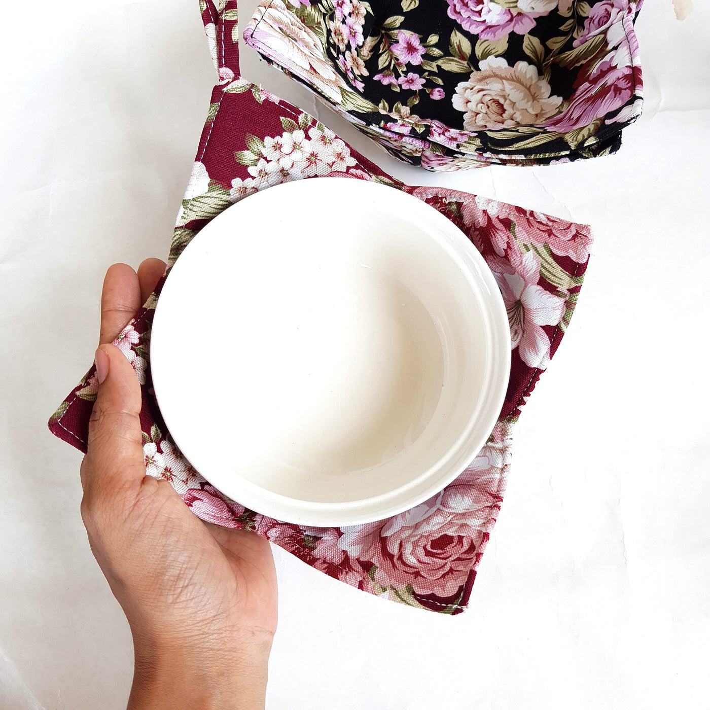 - Q: What colors are available for the Bowl Cozy Holders? A: These specific Bowl Cozy Holders feature a design with red and black roses, suitable for a garden theme.