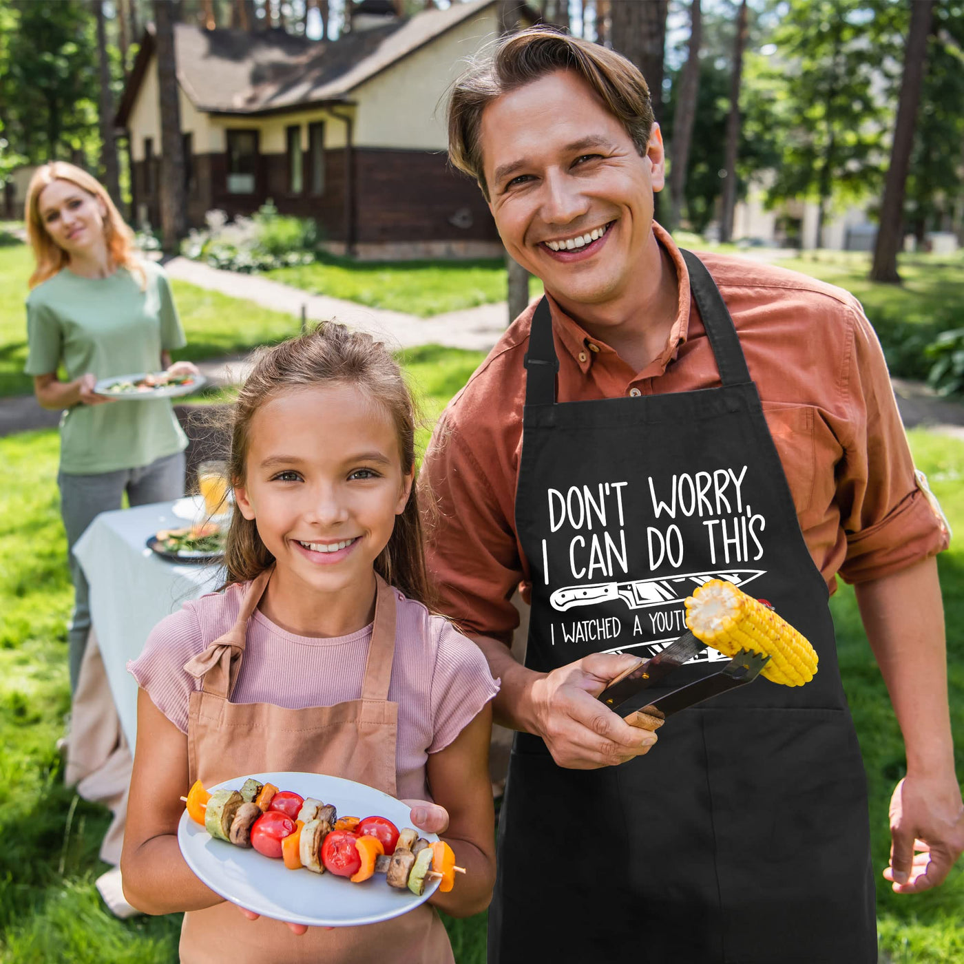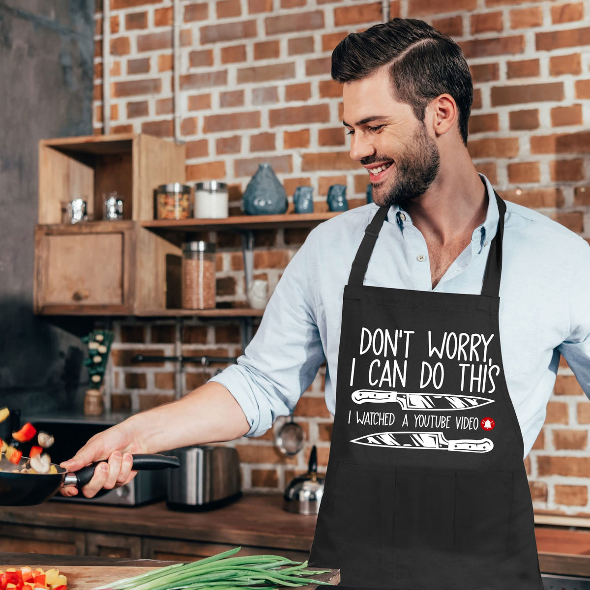 - Q: What is the design featured on these aprons? A: The aprons feature the humorous phrase: 'Don't worry, I can do this I watched a youtube video,' adding a fun touch to cooking.