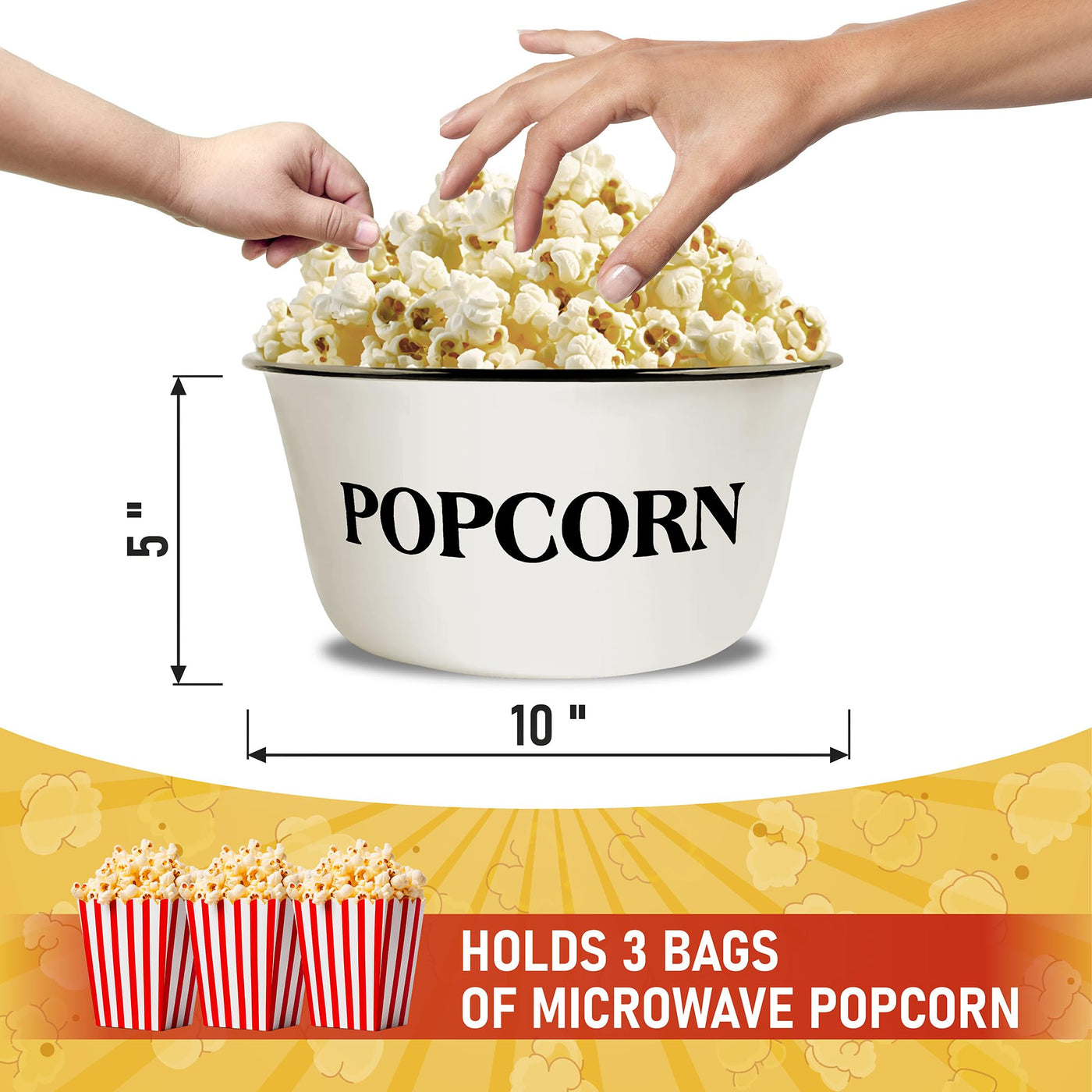 Cwi 3.7-Quart Enamelware Popcorn Bowl - Round White Dish With Black Touches For Cinema Nights And Camping - Classic White With B