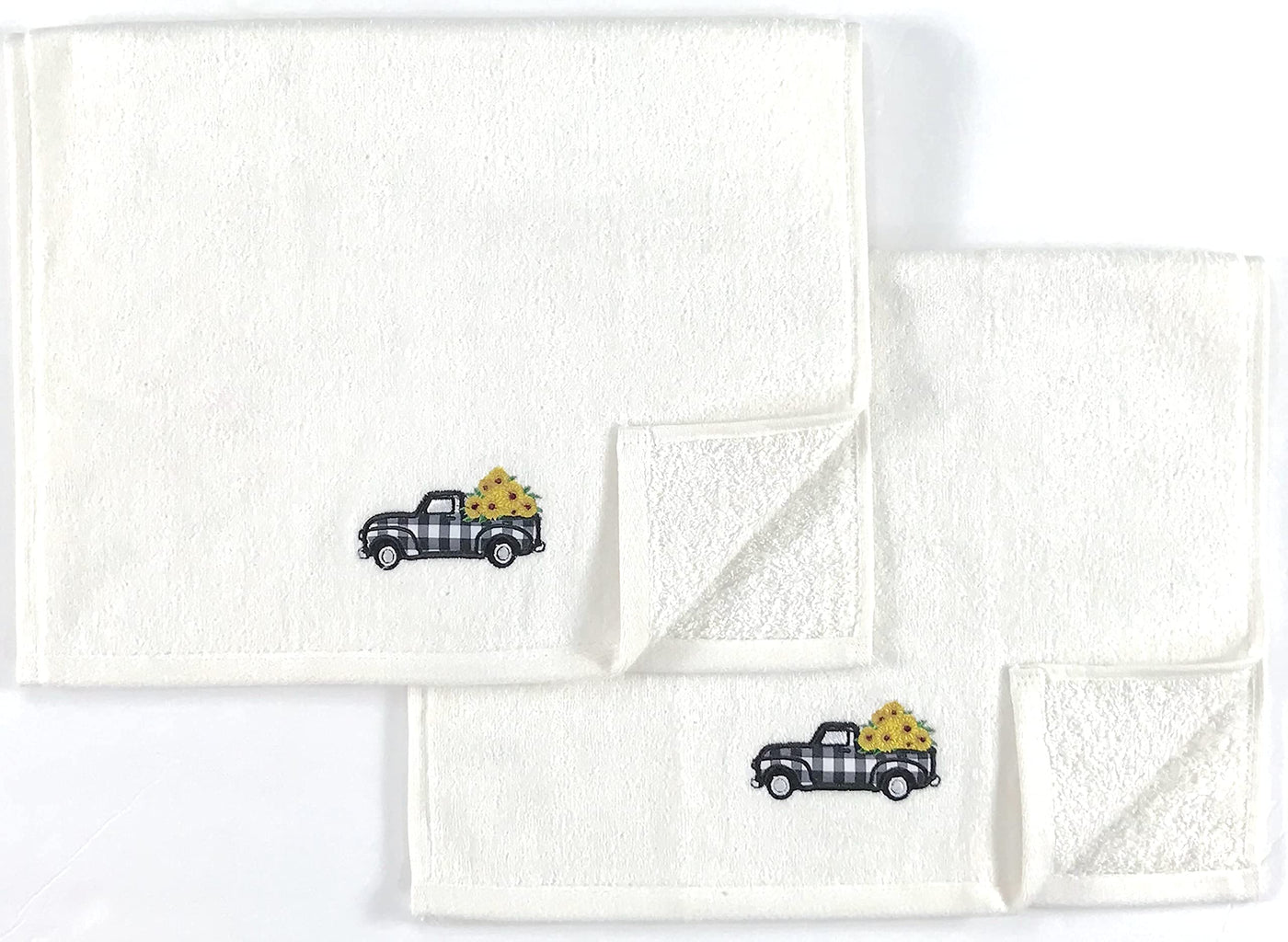 Decorative Fall Hand Towels: Farmhouse Black White Check Truck With Sunflowers Load Embroidered Design, Plush Velour Cotton, Set