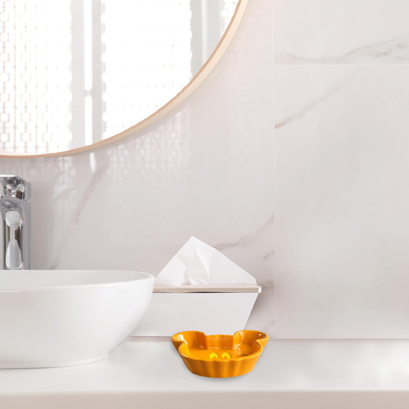 - Q: Does this soap dish have any specific design features? A: The soap dish features an exquisite design showcasing Mickey Mouse as a pumpkin, adding a charming touch to your bathroom décor.