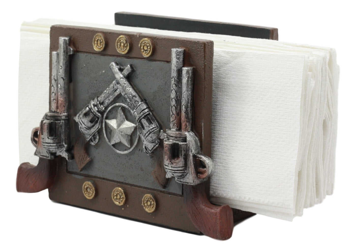- Q: What style does this napkin holder represent? A: This napkin holder features a rustic country western style, complete with a Texas Lone Star and old-fashioned six-shooter pistols.