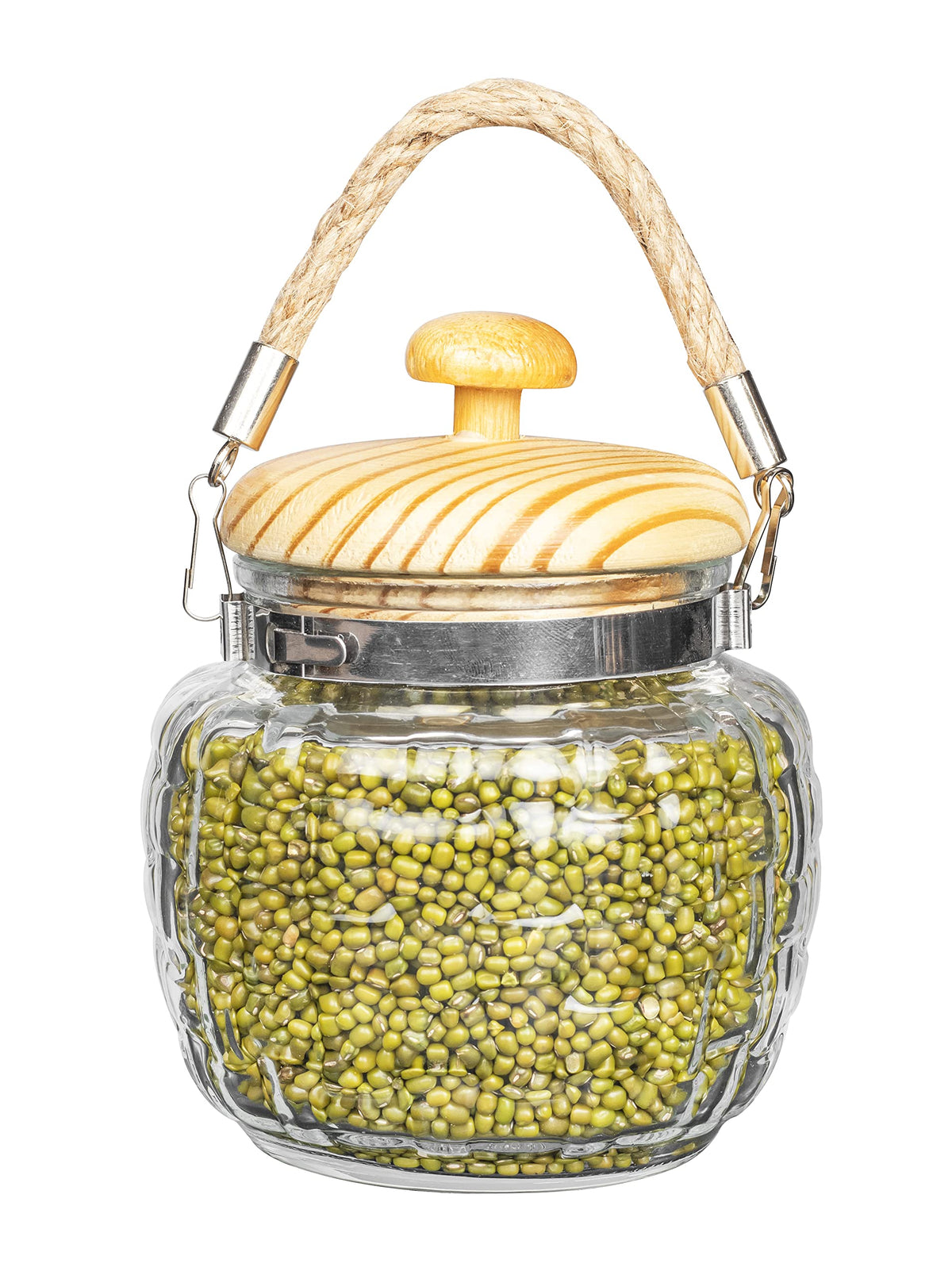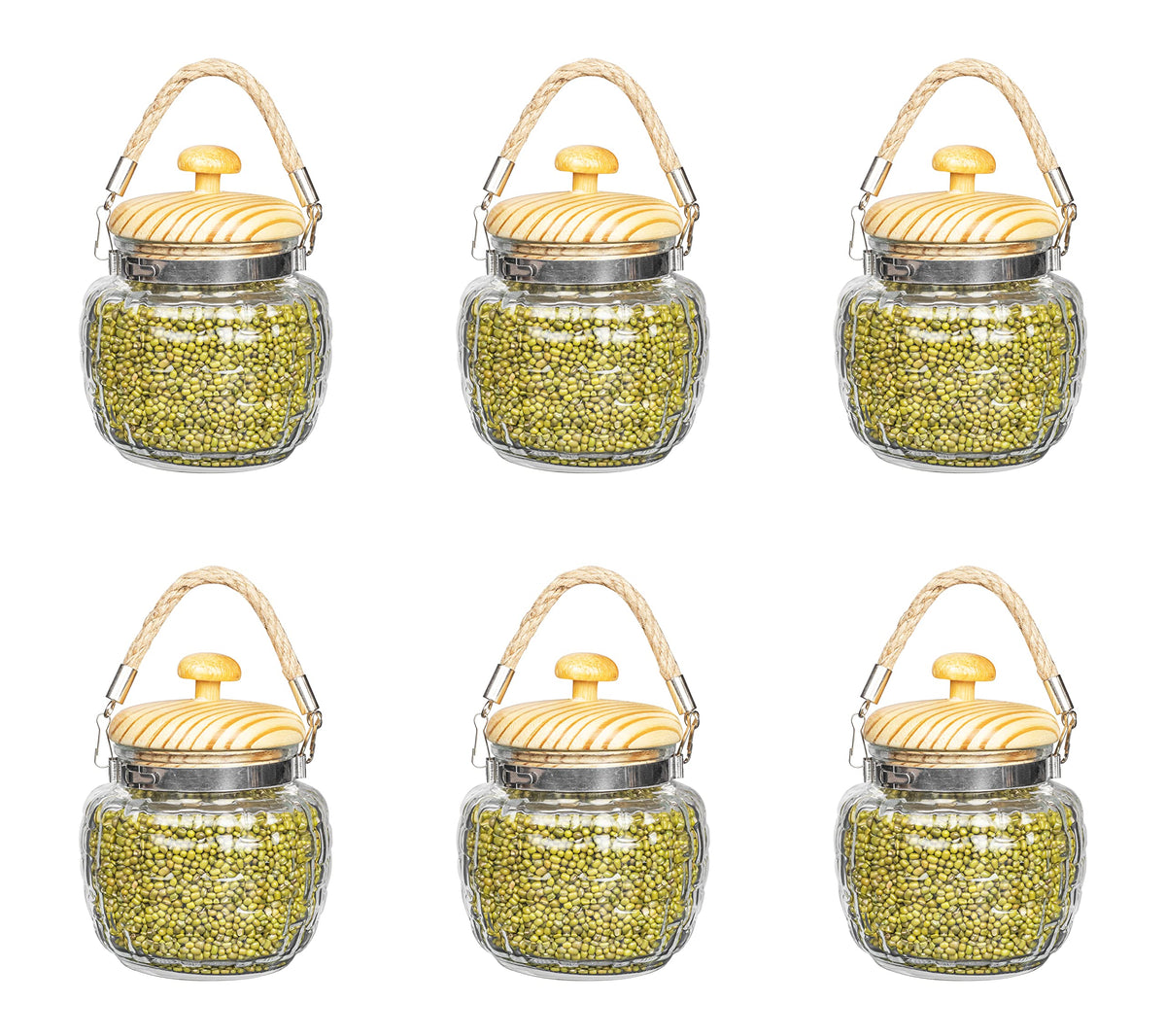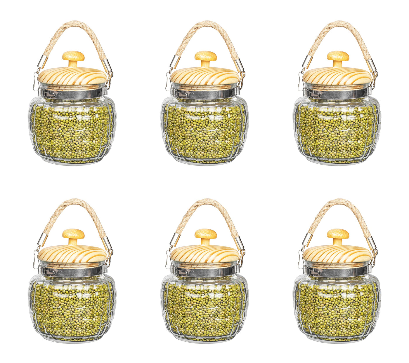 Femora Kitchen Storage Jars Embossed Glass Jar With Wooden Lid & Jute Chain Air Tight Jar, 500 ML, Pack of 6
