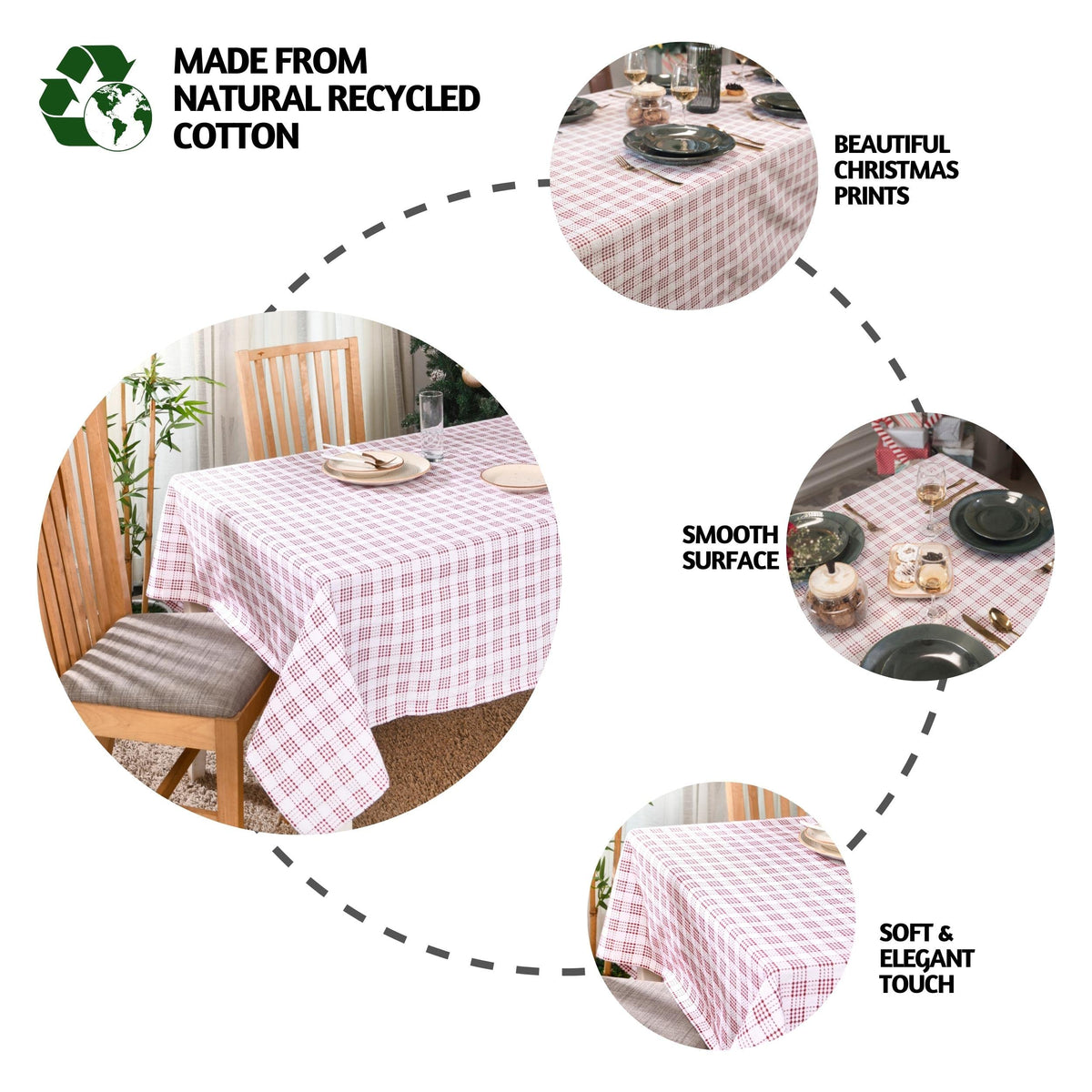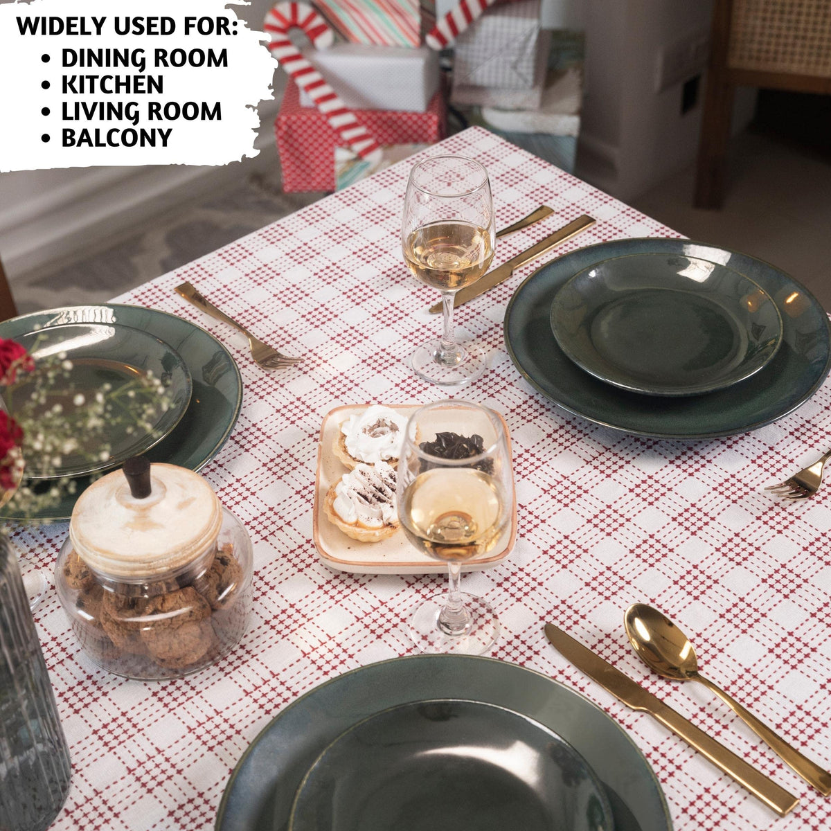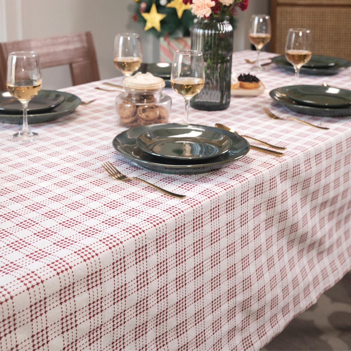 - Q: What design does the tablecloth feature? A: The tablecloth features a modern plaid design with a red tic-tic pattern that adds a joyful vibe to your dining experience.