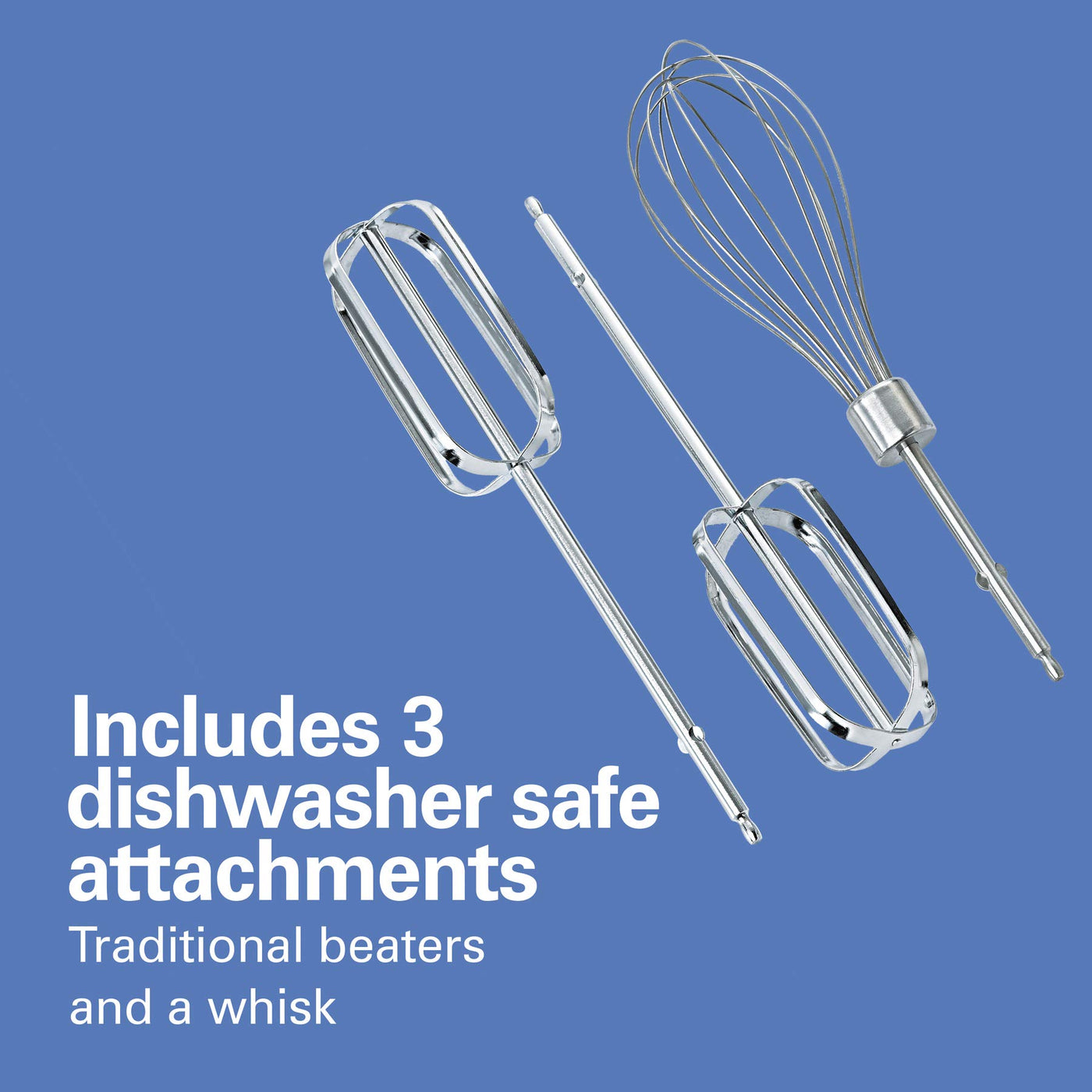 • Q: What attachments are included with the hand mixer? A: The hand mixer comes with a complete three-piece attachment set, including two dishwasher safe traditional beaters and a whisk.