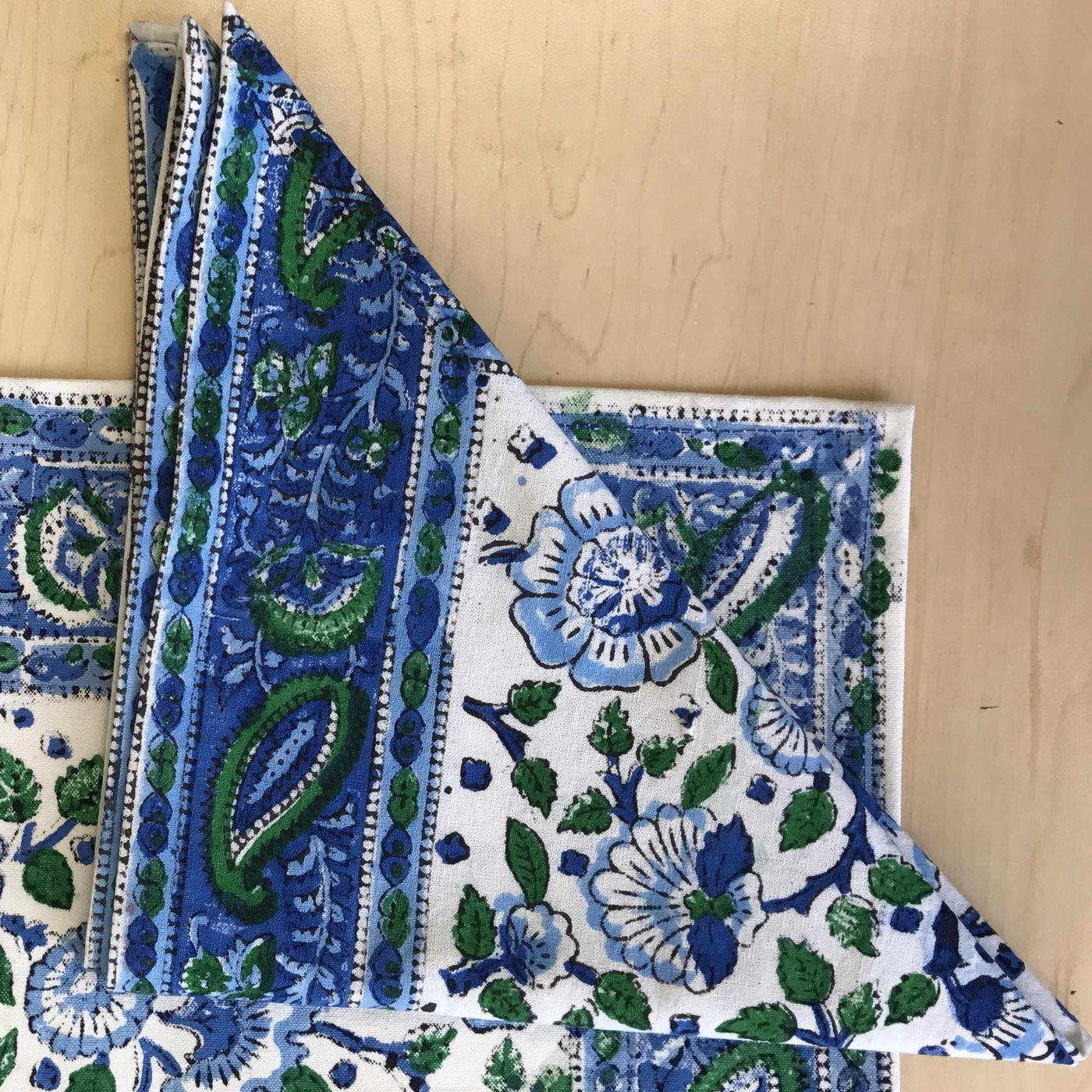 Handmade 100% Cotton Floral Block Print Napkin Table Linen Blue Green 19'' X 19''