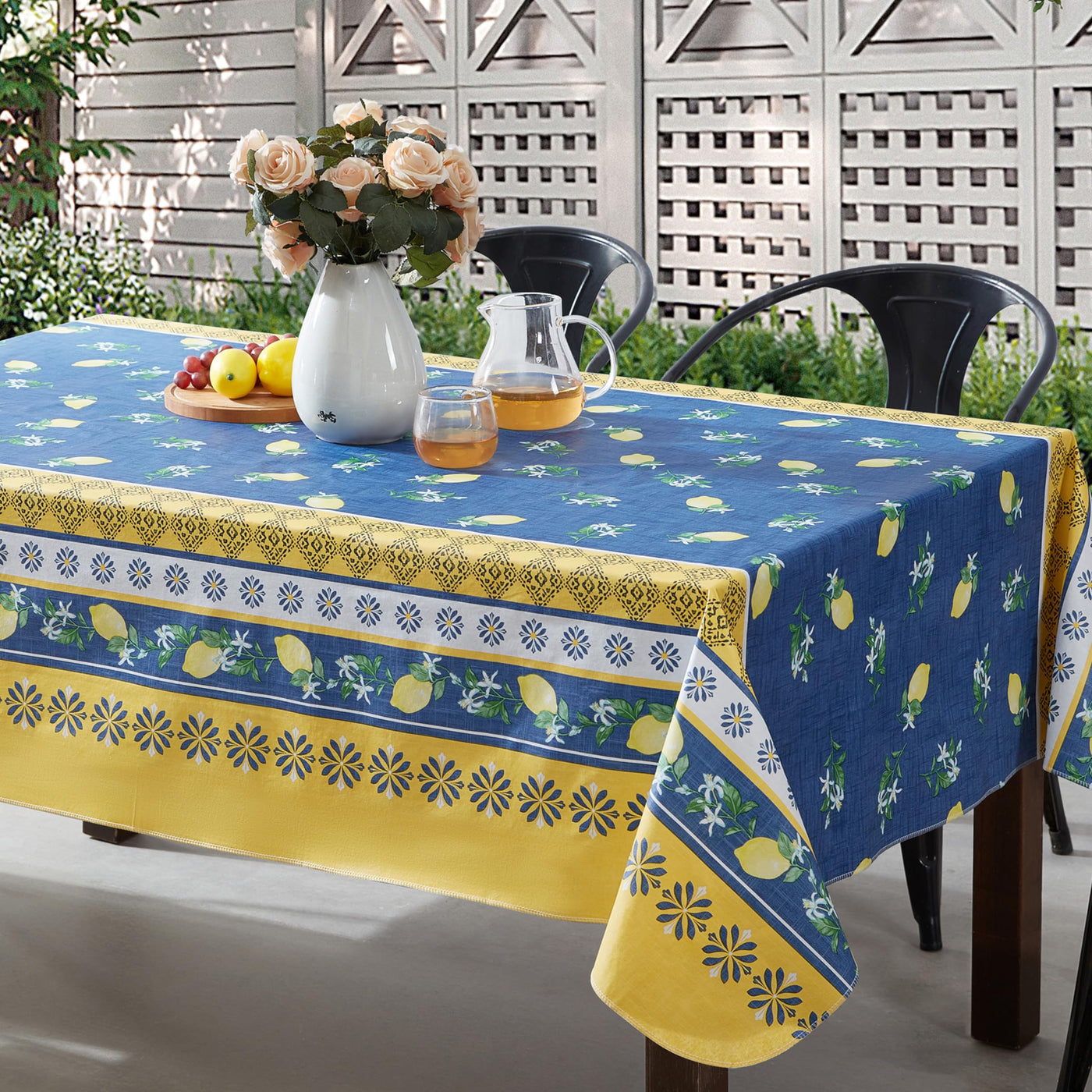 - Q: What design features does the tablecloth have? A: The tablecloth features a colorful lemon theme print with borders of lemons, flowers, and Mediterranean tile patterns on a rich royal blue background.