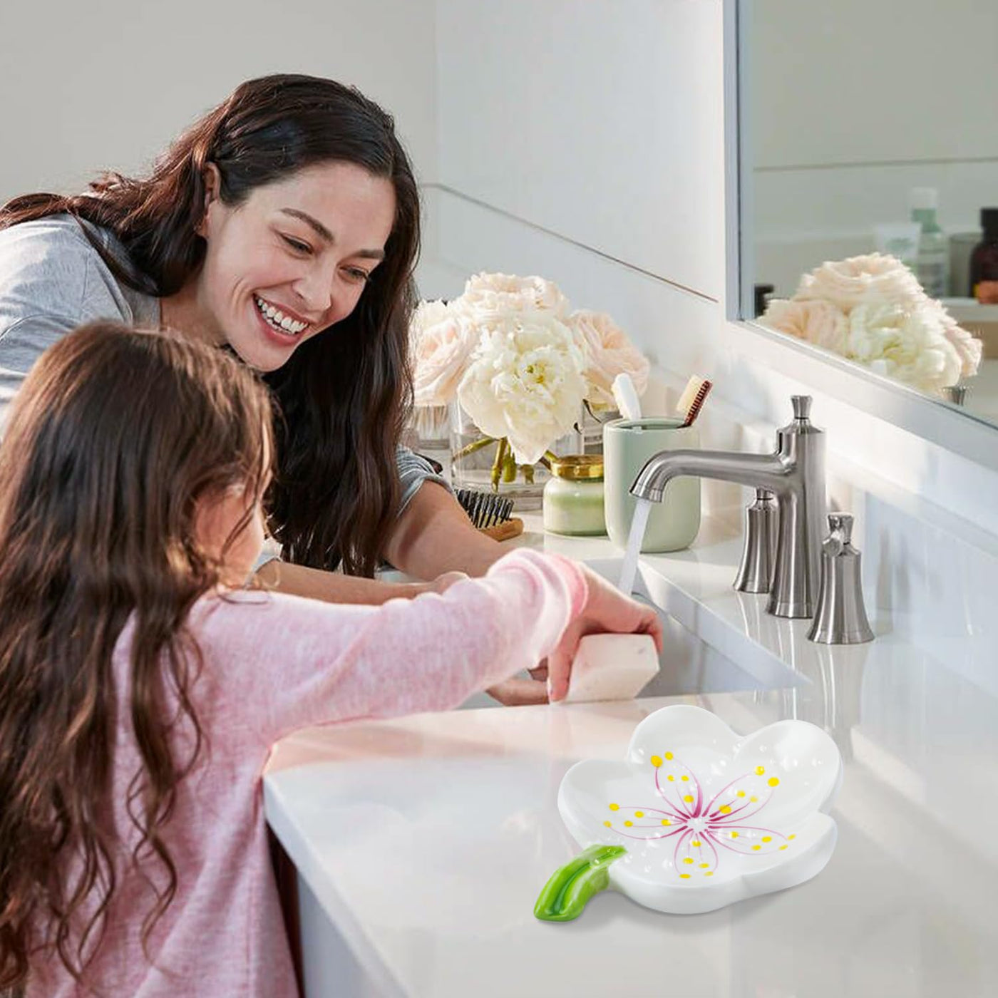 - Q: How does the self-draining feature work? A: The flower stem design of the soap holder acts as a drain, allowing excess water to escape and keeping the soap dry and prolonging its life.