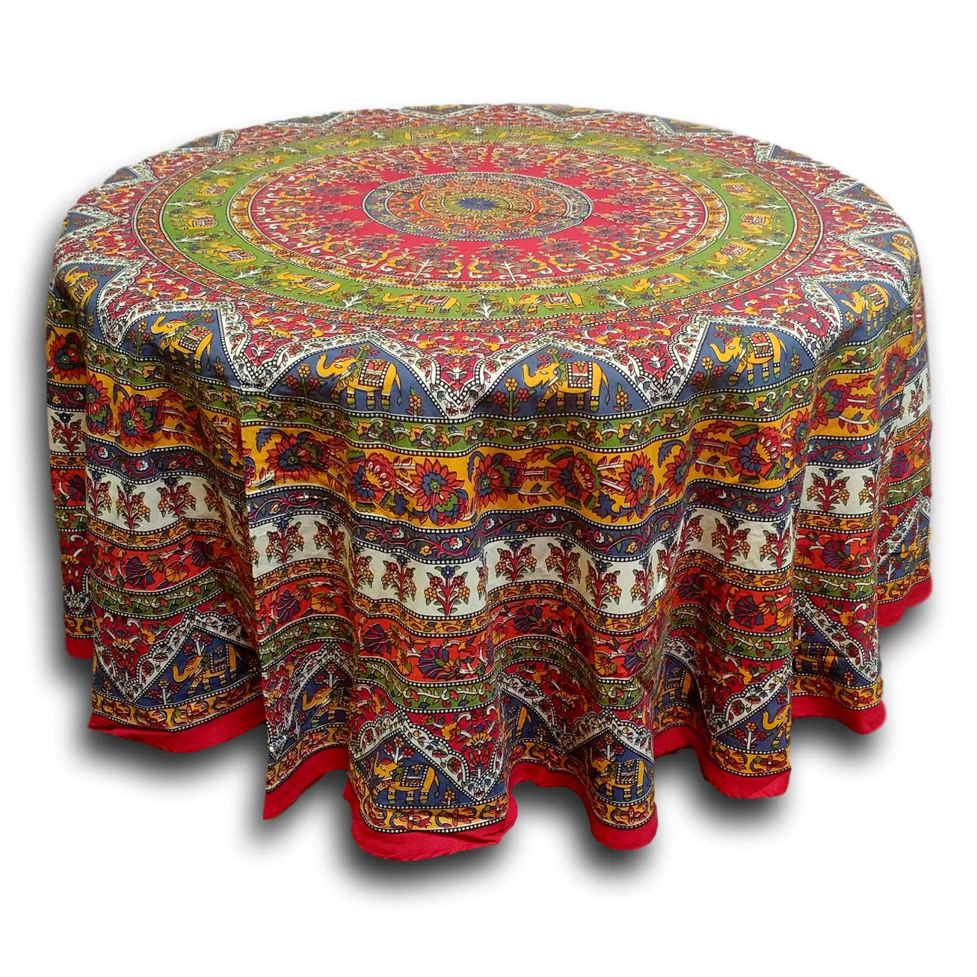 India Arts Elephant Mandala Floral Print Red Tablecloth Round For Dining And Kitchen Cotton Table Linen Red Green Blue
