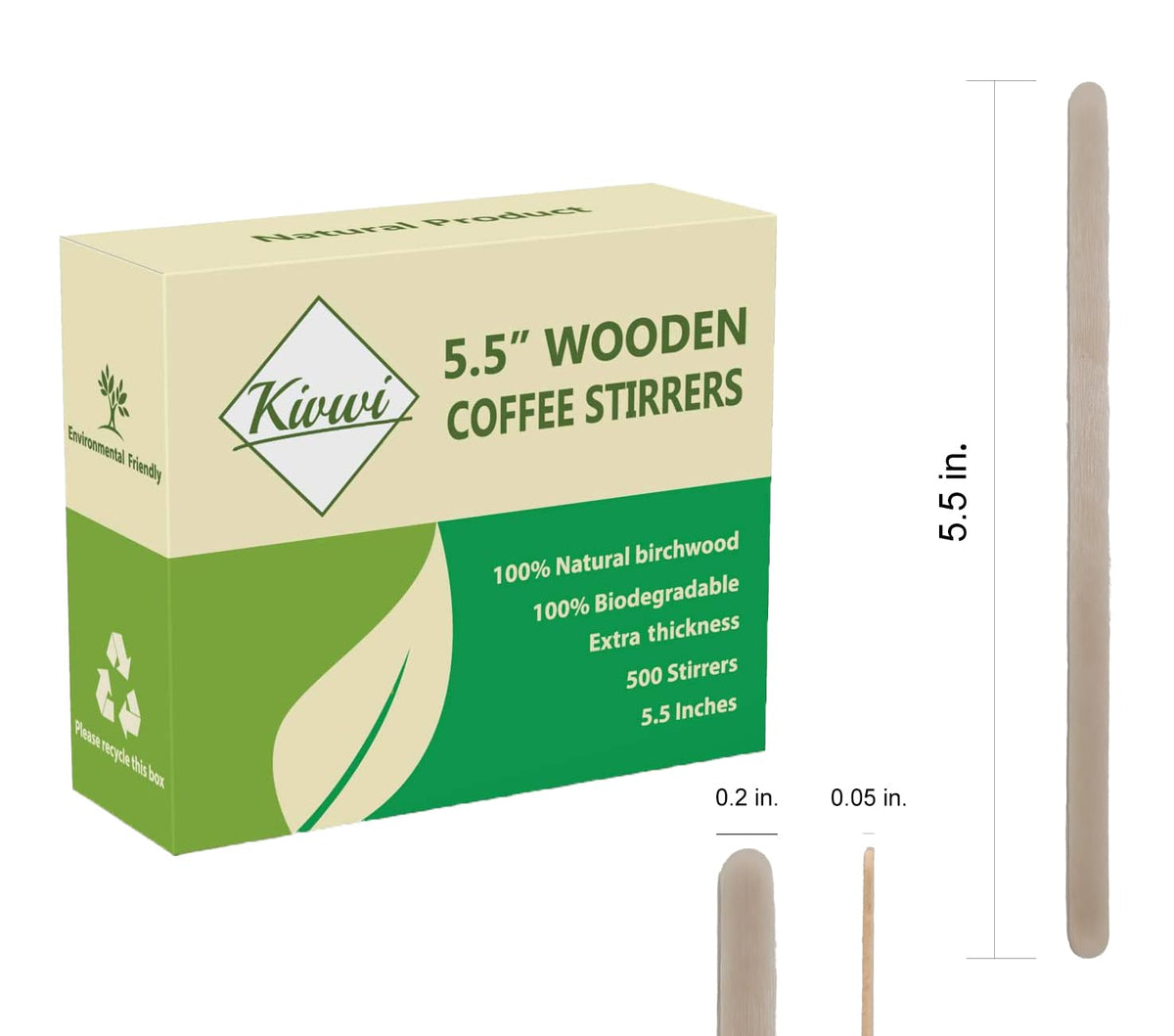 • Q: How many stirrers come in a box? A: Each box contains 500 Kivwi Premium Wooden Coffee Stirrers.