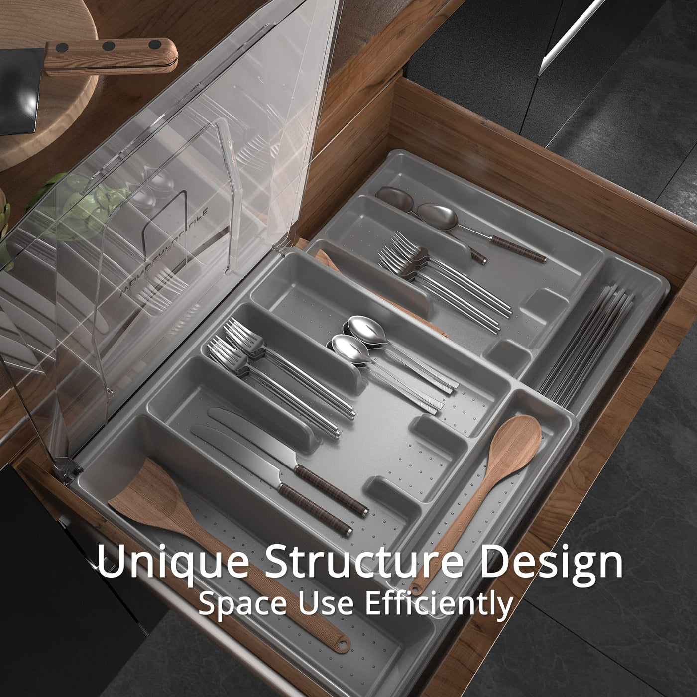 Kurberson Double Layer Silverware Organizer With Lid, Utensil Holder With Cover, Flatware Cutlery Storage Oranizer, Gray