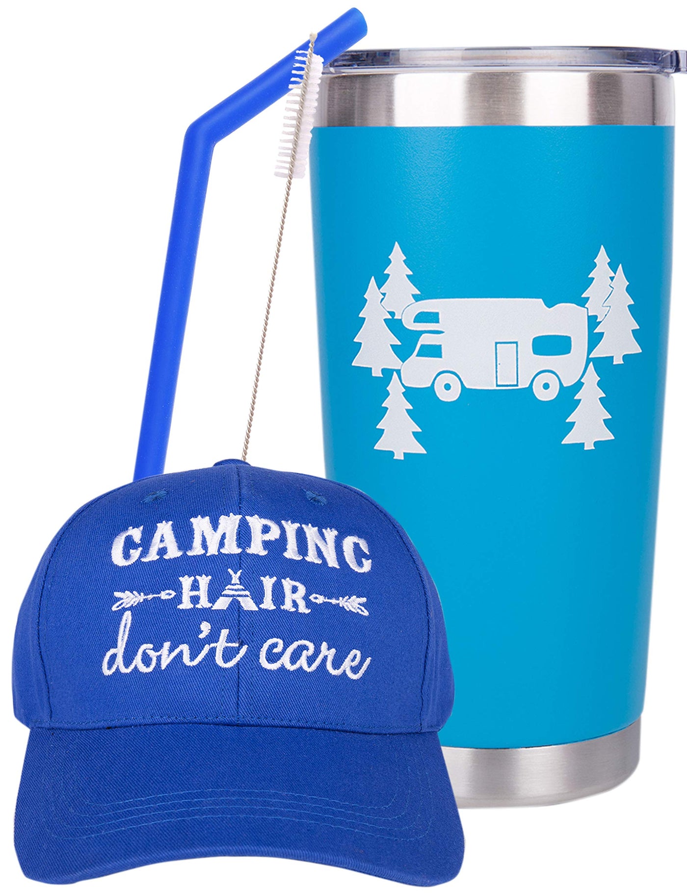 - Q: What is included in the LittleBlueDeer Camping Gifts set? A: The LittleBlueDeer Camping Gifts set includes one Blue Happy Camper Stainless Steel Tumbler and one Blue Camping Hair Don’t Care Hat with the phrase printed on it.