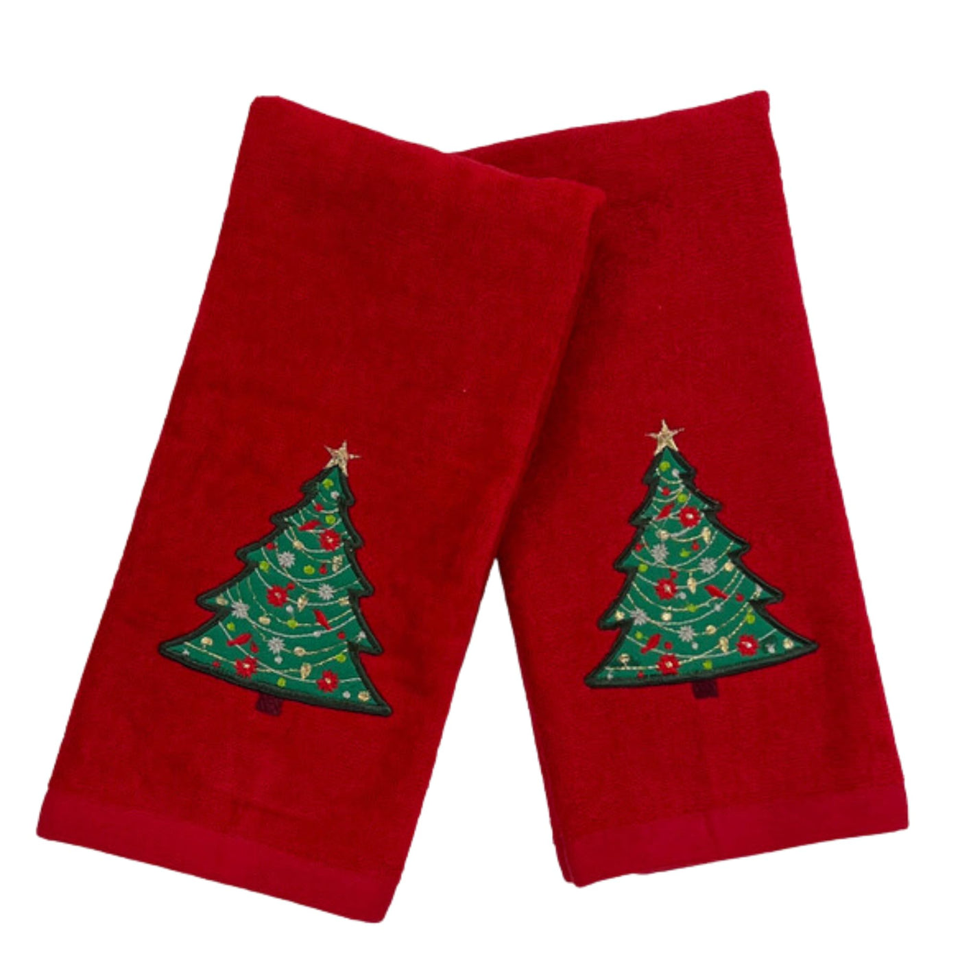 Luxury Holiday Christmas Hand Towels: Traditional Decorated Tree, Velour Terry Red Bathroom Towels, Set Of 2, 16 X 25