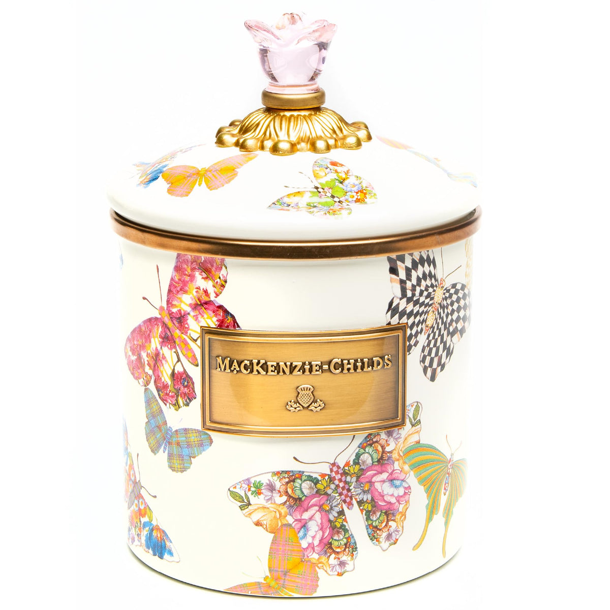 - Q: Does the canister come with a lid? A: Yes, the MacKenzie-Childs Butterfly Garden Enamel Canister includes a lid to keep its contents secure and fresh.