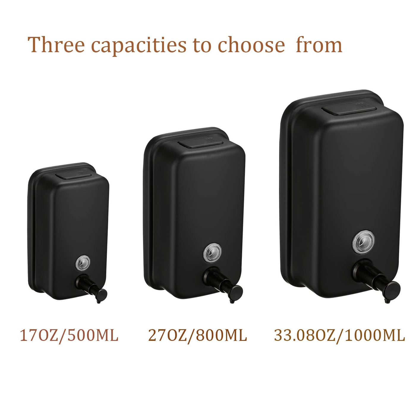 - Q: What is the capacity of the Matte 304 Stainless Steel Soap Dispenser? A: The soap dispenser is available in three capacities: 500 milliliters (17 ounces), 800 milliliters (27 ounces), and 1000 milliliters (33.8 ounces).