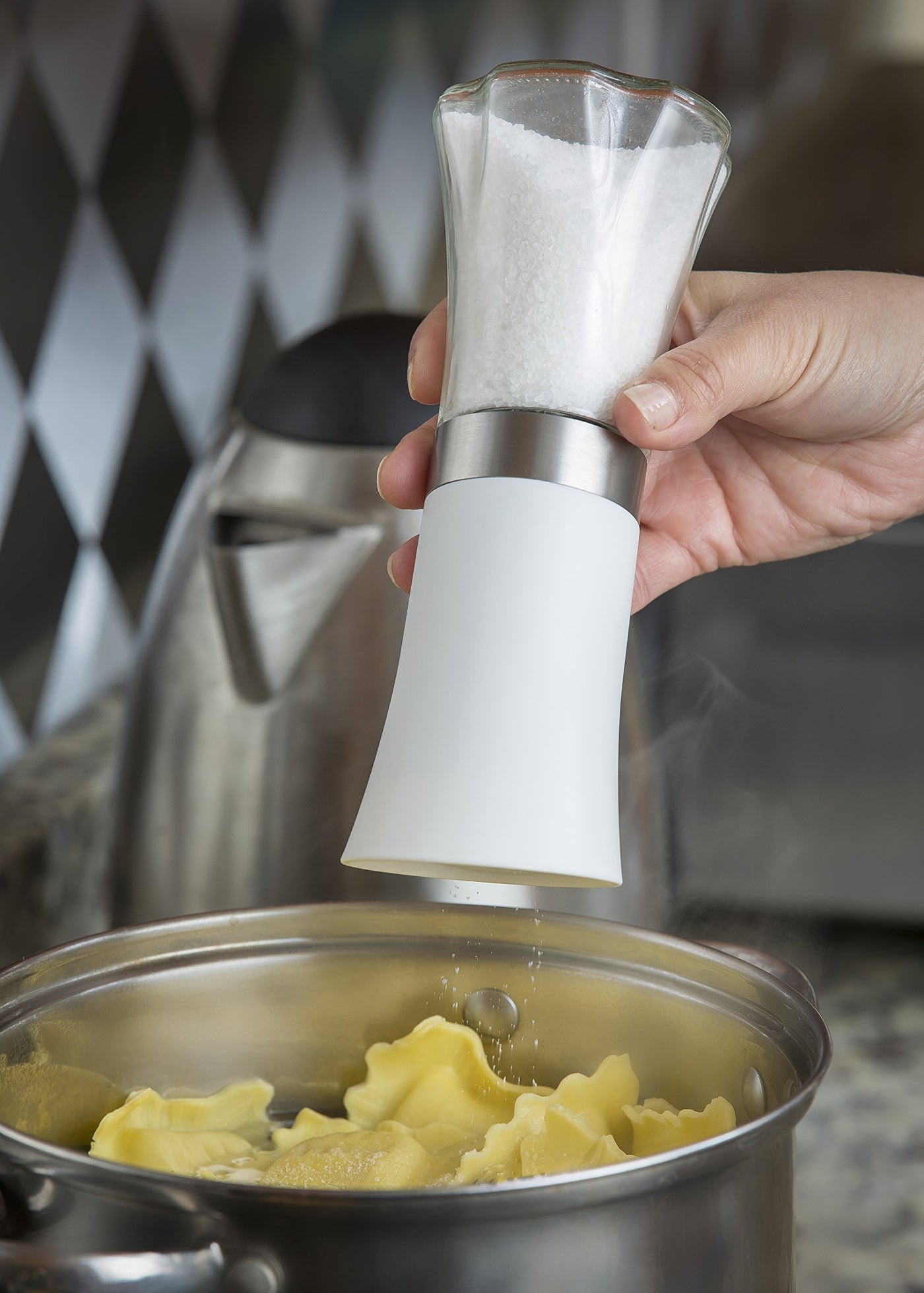 • Q: How does the gravity sensor work in the salt and pepper grinders? A: The gravity sensor activates when the grinder is turned upside down, automatically starting the grinding process for fresh pepper or salt.