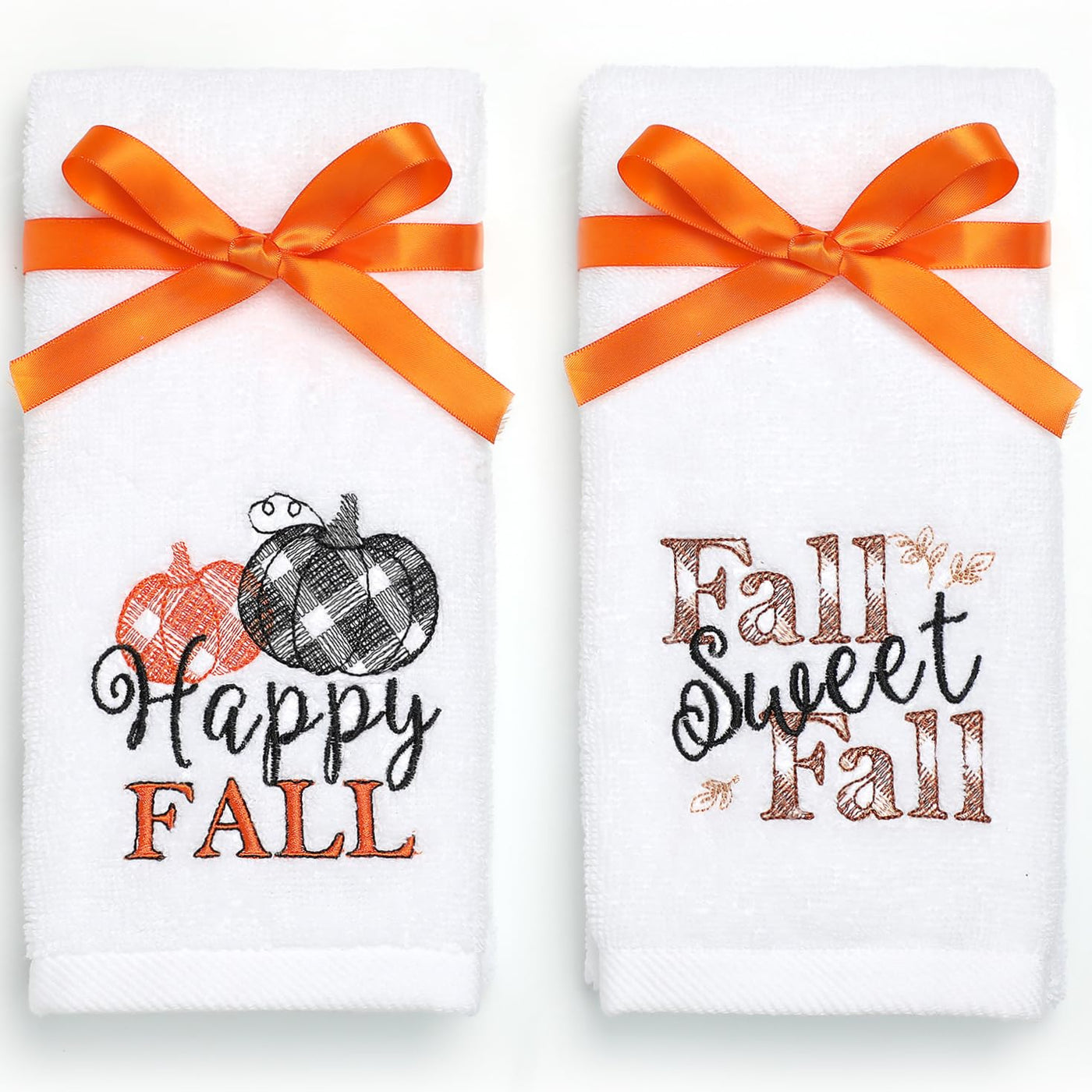 - Q: What designs are featured on the towels? A: The set includes two towels: one with an embroidered pumpkin design and the other with a sweet fall pattern.
